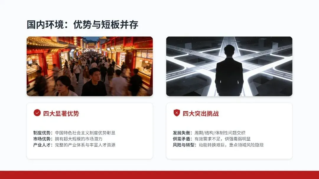 国内环境优势与短板并存。优势在于制度彰显特色,市场规模超大,产业体系完整且人才丰富。但也面临挑战,发展失衡问题交织,供需矛盾突出,动能转换艰巨且风险隐现。我们需扬长补短,推动持续发展。