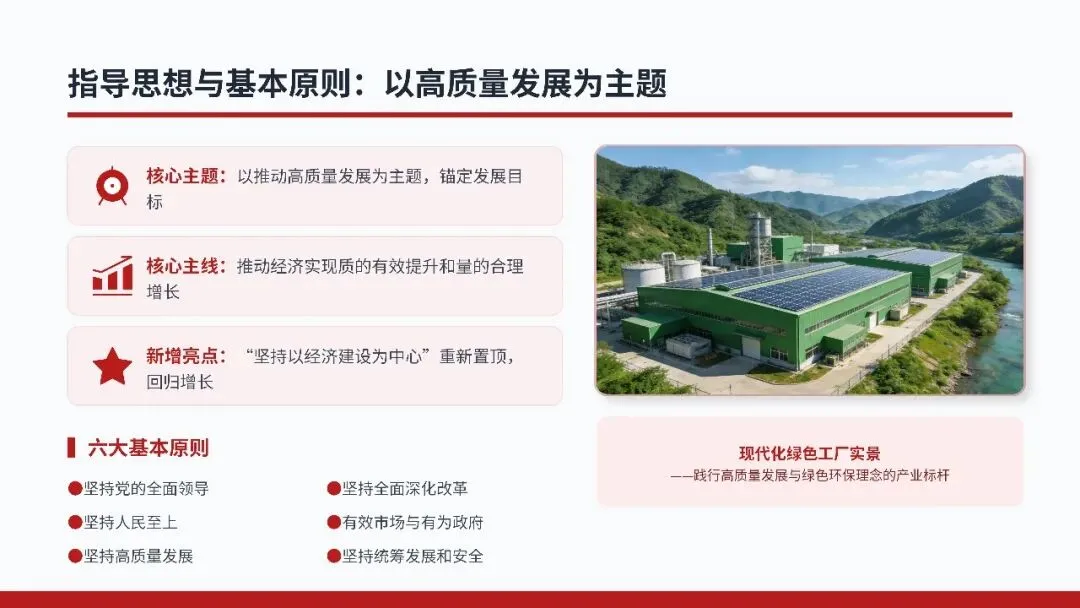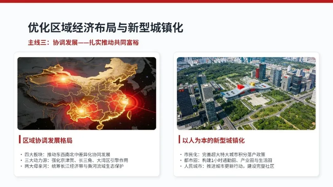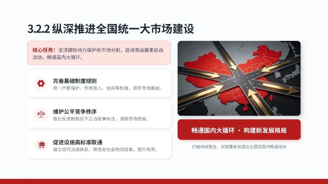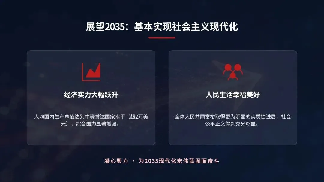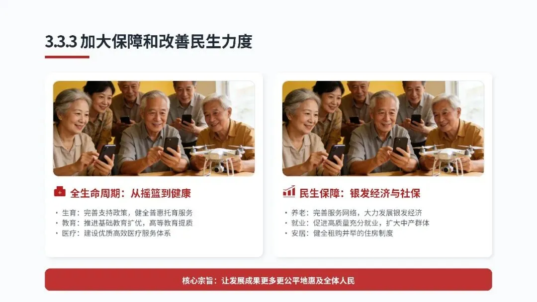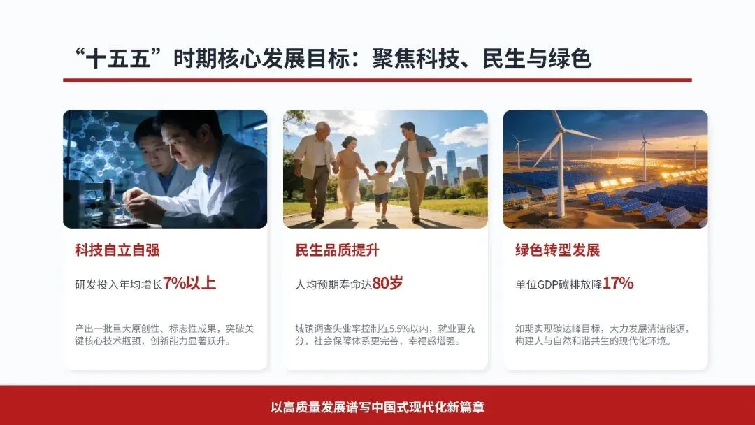 前面我们详细了解了“十五五”规划的时代背景与重大意义,知晓了当下所处的发展环境。接下来,我们自然要思考,在这样的背景下,“十五五”规划要往哪里去,目标是什么。这正是本章节“总体思路与核心目标”要为我们解答的内容。“十五五”规划以高质量发展为主题,推动经济质与量双提升,“坚持以经济建设为中心”重新置顶。同时遵循六大原则,包括党的领导、人民至上等。这体现规划的科学性与前瞻性,为经济发展指明方向,如现代化绿色工厂就是践行理念的标杆。“十五五”核心发展目标聚焦科技、民生与绿色。科技上,研发投入增长超7%,突破技术瓶颈;民生方面,人均寿命达80岁,失业率控在5.5%内;绿色转型要降碳17%,达碳达峰。这将以高质量发展谱写中国式现代化新篇章。前面明确了发展目标,接下来关键是如何实现。核心任务与战略举措就是达成目标的抓手。这意味着我们要找到具体方法和途径,精准发力,确保目标稳步推进,为“十五五”发展奠定坚实基础。建设现代化产业体系需科技创新“四轮驱动”。传统产业要高端化、智能化升级;新兴与未来产业聚焦低空经济、新能源等;现代服务业要专业化、高品质化;新型基础设施统筹传统与新基建。如低空经济以无人机物流等打造新质生产力标杆。要抢占未来产业新赛道,需前瞻布局量子科技与具身智能。布局量子科技,旨在构建新经济增长点,在颠覆性技术领域取得原创突破,掌握发展主动权。发展具身智能,推动其与实体经济融合,让智能机器人走进各行业,成为新质生产力重要部分。深入推进数字中国建设,核心驱动是“人工智能+”行动。将AI提升为通用技术,成为各行业创新发展新引擎,实现“AI+”深度渗透。其基础支撑是数算一体底座,强化算力、算法、数据,构建数字基建体系,为数字经济筑牢根基。“十五五”期间,加快经济社会全面绿色转型,将环保约束转变为高质量发展引擎。实施碳排放“双控”筑牢根基,构建新型能源体系推动变革,聚焦绿色产业撬动万亿市场,倡导“以竹代塑”践行绿色生活,全方位助力生态保护。建设强大国内市场,要以扩大内需为战略基点,提高居民消费率。为此,需增加收入夯实消费基础,优化供给释放消费潜力,优化结构扩大有效投资。现代化购物中心的繁荣,正体现出我国内需市场韧性与升级潜力。纵深推进全国统一大市场建设,核心是破除地方保护与市场分割,促进商品要素自由流动。要完善基础制度规则,统一标准筑牢市场基础;维护公平竞争秩序,清除壁垒;促进设施联通,降成本提效率,以畅通国内大循环,构建新发展格局。深化改革与扩大开放是关键。核心改革聚焦激发市场主体活力,落实民营经济促进法保障要素使用,推进国资国企改革助力金融强国建设。开放迈向制度型新阶段,从“要素流动”转向“制度型开放”,扩大服务业准入,高标准建设海南自贸港。优化区域经济布局与新型城镇化,以协调发展推动共同富裕。区域上,推动东西南北中差异化协同,强化京津冀等引擎作用,统筹长江与黄河流域生态。城镇化方面,完善落户政策,构建都市圈,推进城市更新、建设完整社区。加快农业农村现代化,推进乡村全面振兴,要多管齐下。提升农业综合生产能力,严守粮食安全底线,强化科技支撑。建设宜居宜业和美乡村,借鉴“千万工程”经验,推动产业融合。完善帮扶机制,巩固脱贫成果,防止规模性返贫。加大保障和改善民生力度,贯穿全生命周期。生育上完善政策、健全托育,教育推进扩优提质,医疗建设优质体系。民生保障聚焦银发经济与社保,完善养老服务、促进就业、健全住房制度,让发展成果更公平惠及全体人民。筑牢国家经济安全需把握三大支柱。粮食要确保自给自足,提升产能;能源要加强产供储销体系,增储上产;产业链要提升自主可控水平,攻克核心技术。统筹发展与安全,方能筑牢现代化建设根基。前面我们了解了经济建设各方面的举措,涵盖市场建设、区域发展、乡村振兴等。现在,我们将目光投向未来。这一页“创新亮点与未来展望”能让我们清晰看到规划的新方向和新突破。接下来,让我们一起探寻新在何处,未来怎样。“十五五”规划有四大核心亮点。政策回归经济建设中心,兼顾促增长与防风险;突出“新质生产力”,强调科技、数字与绿色化融合;“人工智能+”提升为通用技术;深化制度型开放,对接制度层面。规划引领未来,改革驱动发展。到2035年我国将基本实现社会主义现代化。届时经济实力大幅跃升,人均GDP超2万美元,综合国力显著增强。同时,人民生活幸福美好,共同富裕取得明显进展,社会公平正义充分彰显。让我们凝心聚力,为这一宏伟蓝图奋斗!希望大家通过今天的内容,对相关规划有了更清晰的认识。“智水科创”秉持理念不断前行,期待未来与大家携手,一同见证更多发展成果。感谢相伴!