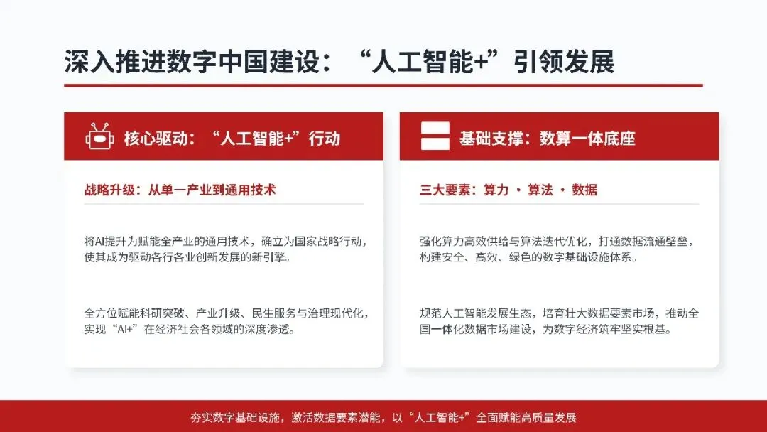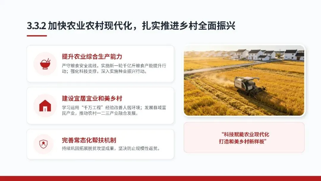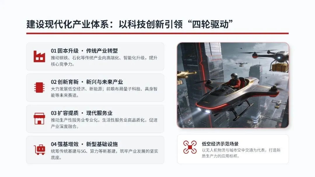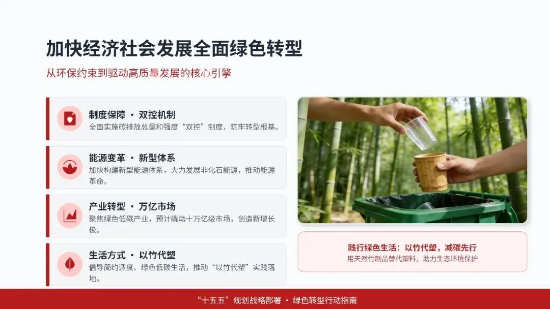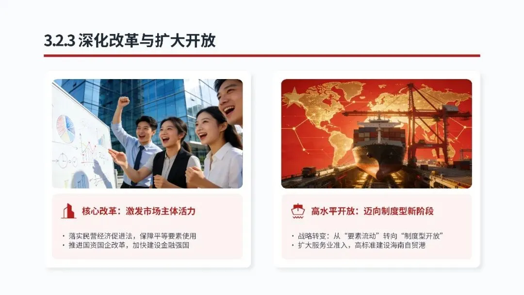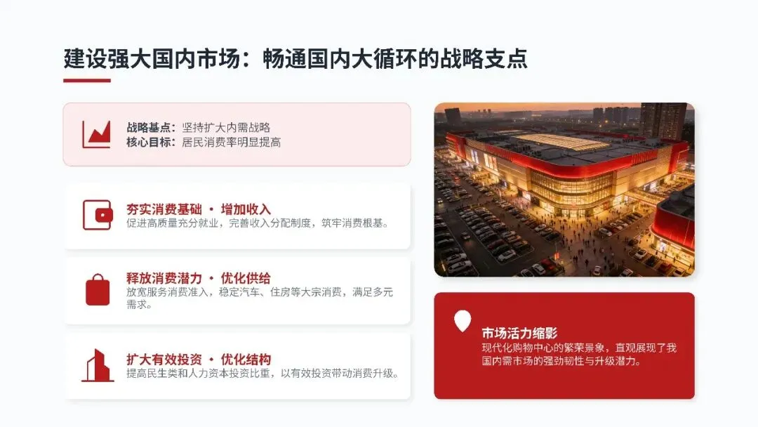 前面我们详细了解了“十五五”规划的时代背景与重大意义,知晓了当下所处的发展环境。接下来,我们自然要思考,在这样的背景下,“十五五”规划要往哪里去,目标是什么。这正是本章节“总体思路与核心目标”要为我们解答的内容。“十五五”规划以高质量发展为主题,推动经济质与量双提升,“坚持以经济建设为中心”重新置顶。同时遵循六大原则,包括党的领导、人民至上等。这体现规划的科学性与前瞻性,为经济发展指明方向,如现代化绿色工厂就是践行理念的标杆。“十五五”核心发展目标聚焦科技、民生与绿色。科技上,研发投入增长超7%,突破技术瓶颈;民生方面,人均寿命达80岁,失业率控在5.5%内;绿色转型要降碳17%,达碳达峰。这将以高质量发展谱写中国式现代化新篇章。前面明确了发展目标,接下来关键是如何实现。核心任务与战略举措就是达成目标的抓手。这意味着我们要找到具体方法和途径,精准发力,确保目标稳步推进,为“十五五”发展奠定坚实基础。建设现代化产业体系需科技创新“四轮驱动”。传统产业要高端化、智能化升级;新兴与未来产业聚焦低空经济、新能源等;现代服务业要专业化、高品质化;新型基础设施统筹传统与新基建。如低空经济以无人机物流等打造新质生产力标杆。要抢占未来产业新赛道,需前瞻布局量子科技与具身智能。布局量子科技,旨在构建新经济增长点,在颠覆性技术领域取得原创突破,掌握发展主动权。发展具身智能,推动其与实体经济融合,让智能机器人走进各行业,成为新质生产力重要部分。深入推进数字中国建设,核心驱动是“人工智能+”行动。将AI提升为通用技术,成为各行业创新发展新引擎,实现“AI+”深度渗透。其基础支撑是数算一体底座,强化算力、算法、数据,构建数字基建体系,为数字经济筑牢根基。“十五五”期间,加快经济社会全面绿色转型,将环保约束转变为高质量发展引擎。实施碳排放“双控”筑牢根基,构建新型能源体系推动变革,聚焦绿色产业撬动万亿市场,倡导“以竹代塑”践行绿色生活,全方位助力生态保护。建设强大国内市场,要以扩大内需为战略基点,提高居民消费率。为此,需增加收入夯实消费基础,优化供给释放消费潜力,优化结构扩大有效投资。现代化购物中心的繁荣,正体现出我国内需市场韧性与升级潜力。纵深推进全国统一大市场建设,核心是破除地方保护与市场分割,促进商品要素自由流动。要完善基础制度规则,统一标准筑牢市场基础;维护公平竞争秩序,清除壁垒;促进设施联通,降成本提效率,以畅通国内大循环,构建新发展格局。深化改革与扩大开放是关键。核心改革聚焦激发市场主体活力,落实民营经济促进法保障要素使用,推进国资国企改革助力金融强国建设。开放迈向制度型新阶段,从“要素流动”转向“制度型开放”,扩大服务业准入,高标准建设海南自贸港。优化区域经济布局与新型城镇化,以协调发展推动共同富裕。区域上,推动东西南北中差异化协同,强化京津冀等引擎作用,统筹长江与黄河流域生态。城镇化方面,完善落户政策,构建都市圈,推进城市更新、建设完整社区。加快农业农村现代化,推进乡村全面振兴,要多管齐下。提升农业综合生产能力,严守粮食安全底线,强化科技支撑。建设宜居宜业和美乡村,借鉴“千万工程”经验,推动产业融合。完善帮扶机制,巩固脱贫成果,防止规模性返贫。加大保障和改善民生力度,贯穿全生命周期。生育上完善政策、健全托育,教育推进扩优提质,医疗建设优质体系。民生保障聚焦银发经济与社保,完善养老服务、促进就业、健全住房制度,让发展成果更公平惠及全体人民。筑牢国家经济安全需把握三大支柱。粮食要确保自给自足,提升产能;能源要加强产供储销体系,增储上产;产业链要提升自主可控水平,攻克核心技术。统筹发展与安全,方能筑牢现代化建设根基。前面我们了解了经济建设各方面的举措,涵盖市场建设、区域发展、乡村振兴等。现在,我们将目光投向未来。这一页“创新亮点与未来展望”能让我们清晰看到规划的新方向和新突破。接下来,让我们一起探寻新在何处,未来怎样。“十五五”规划有四大核心亮点。政策回归经济建设中心,兼顾促增长与防风险;突出“新质生产力”,强调科技、数字与绿色化融合;“人工智能+”提升为通用技术;深化制度型开放,对接制度层面。规划引领未来,改革驱动发展。到2035年我国将基本实现社会主义现代化。届时经济实力大幅跃升,人均GDP超2万美元,综合国力显著增强。同时,人民生活幸福美好,共同富裕取得明显进展,社会公平正义充分彰显。让我们凝心聚力,为这一宏伟蓝图奋斗!希望大家通过今天的内容,对相关规划有了更清晰的认识。“智水科创”秉持理念不断前行,期待未来与大家携手,一同见证更多发展成果。感谢相伴!