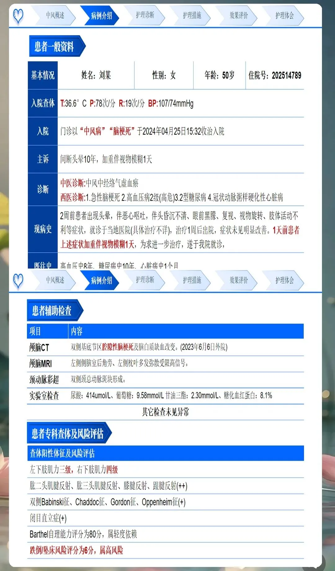 风险评估显示,该患者为高危人群:年龄>65岁、合并高血压糖尿病、房颤病史、神经功能缺损明显。时间窗评估显示,发病3小时,仍在静脉溶栓时间窗内,但需快速完成评估和决策。吞咽功能评估显示,存在轻度吞咽障碍,需警惕误吸风险。跌倒风险评估为高危,需加强防护措施。