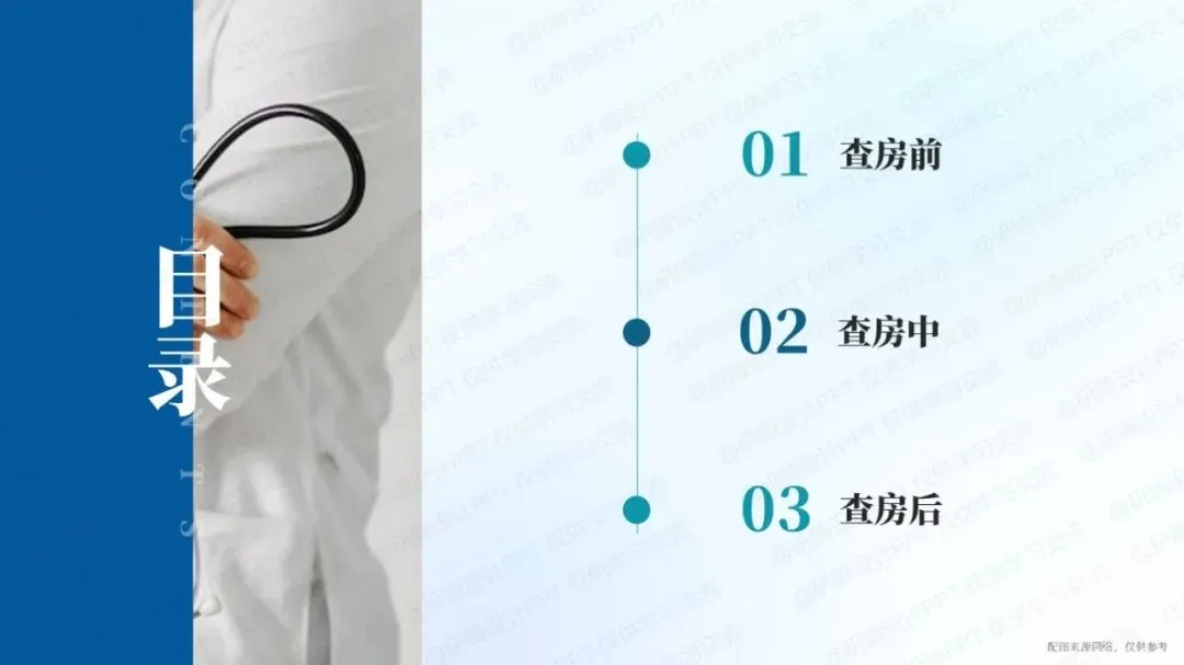 务必保证查房所需物品完备无缺,涵盖查房病例、手消毒液、基础护理工具(像血压计、体温计、听诊器、压舌板、手电筒等),以及专科特定用物。