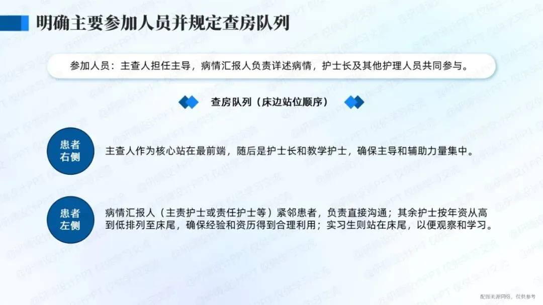 病情汇报人(如主责护士或责任护士)紧邻患者,便于直接与患者沟通。其余护士依照年资从高到低依次排列至床尾,合理发挥经验与资历优势。实习生站在床尾位置,利于观察学习。