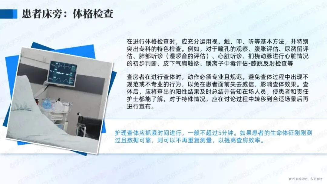病情汇报务必做到内容精炼、准确,能够快速把握患者病情要点。汇报时长应控制在 5 分钟以内,以此高效利用查房时间。