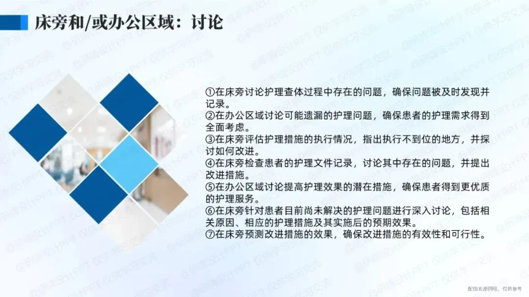 ①在床旁讨论护理查体过程中存在的问题,确保问题被及时发现并记录。②在办公区域讨论可能遗漏的护理问题,确保患者的护理需求得到全面考虑。③在床旁评估护理措施的执行情况,指出执行不到位的地方,并探讨如何改进。④在床旁检查患者的护理文件记录,讨论其中存在的问题,并提出改进措施。⑤在办公区域讨论提高护理效果的潜在措施,确保患者得到更优质的护理服务。⑥在床旁针对患者目前尚未解决的护理问题进行深入讨论,包括相关原因、相应的护理措施及其实施后的预期效果。⑦在床旁预测改进措施的效果,确保改进措施的有效性和可行性。
