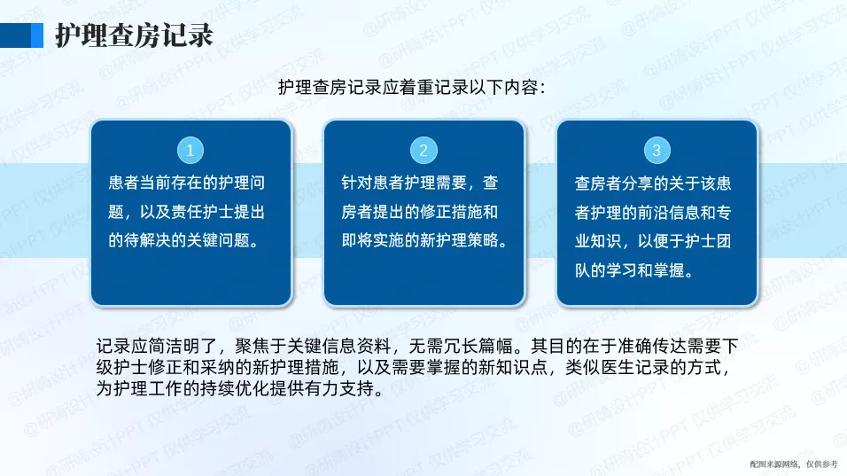 记录应简洁明了,聚焦于关键信息资料,无需冗长篇幅。其目的在于准确传达需要下级护士修正和采纳的新护理措施,以及需要掌握的新知识点,类似医生记录的方式,为护理工作的持续优化提供有力支持。