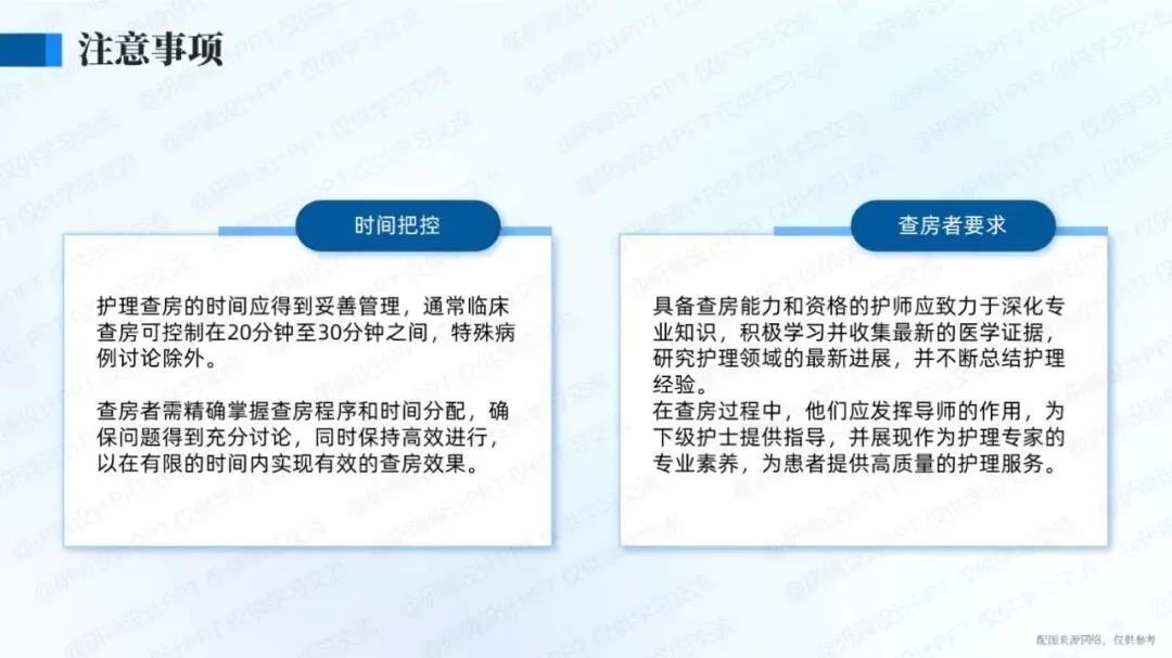 护理查房时间需妥善管理,一般而言,临床查房时长宜控制在 20 至 30 分钟,特殊病例讨论不在此列。查房者要精准掌握查房流程及时间分配,保证问题得以充分探讨,同时维持高效节奏,从而在有限时间内达成良好查房成效。