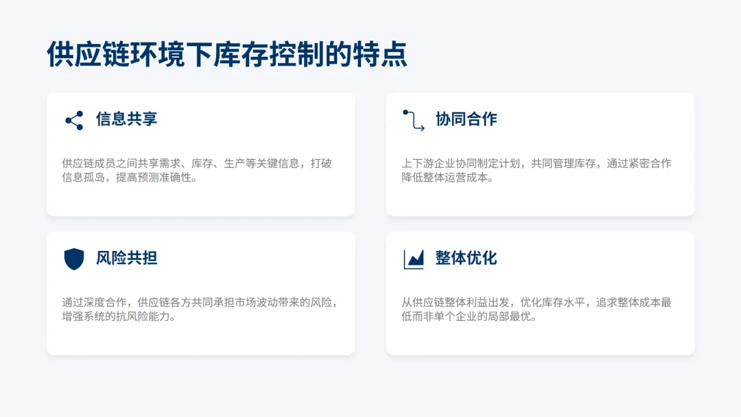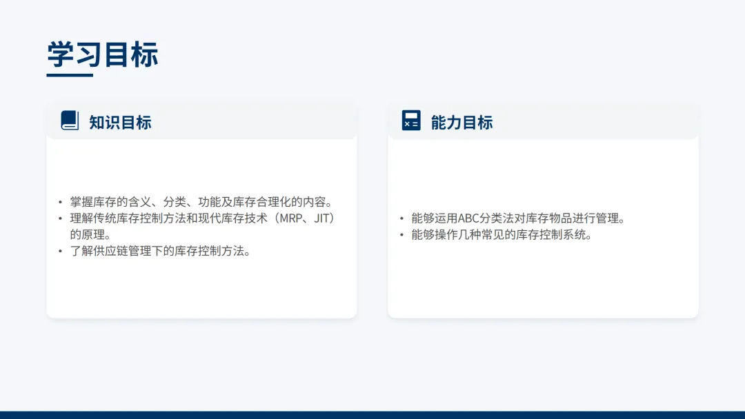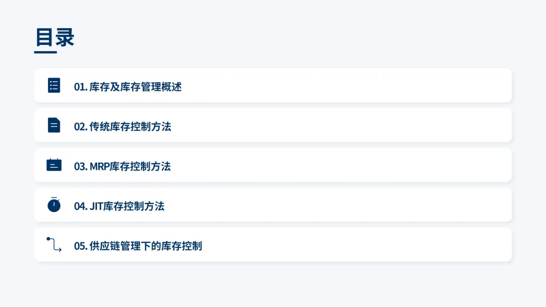 《库存控制与管理方法》是一套系统、实用的企业内部培训或教学课件,共53页,内容涵盖库存管理的理论基础、传统与现代控制方法,以及供应链视角下的先进策略。适合企业管理者、供应链从业人员、物流相关工作等群体学习与参考。