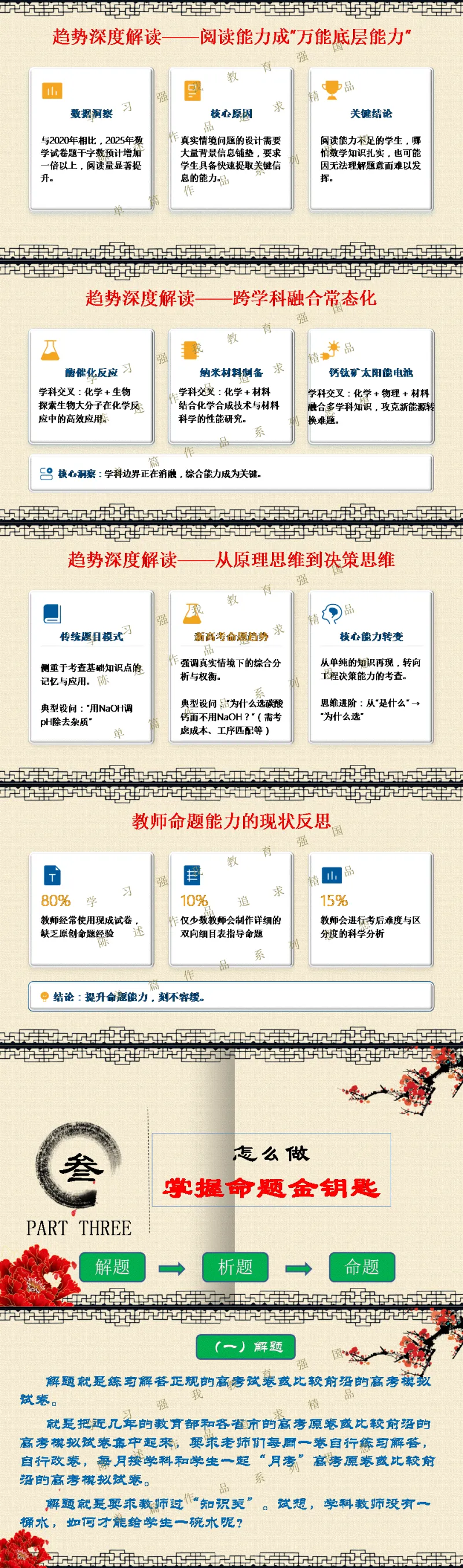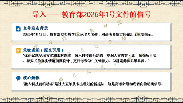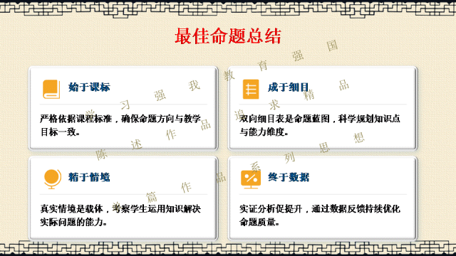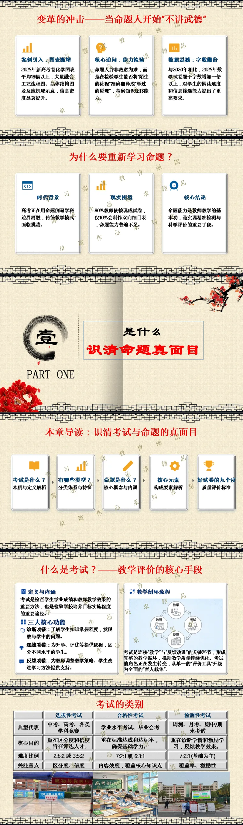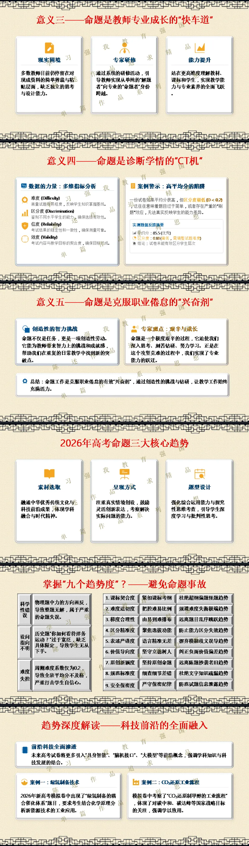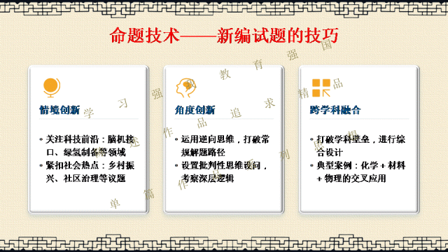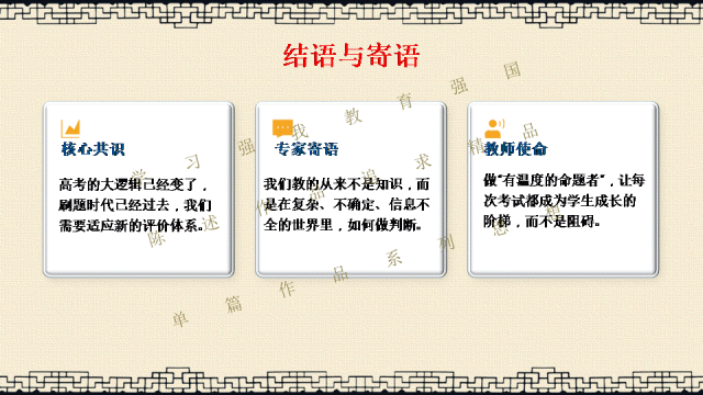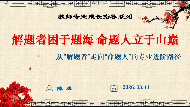 选择关注,关注陈述教学公众号,能力会提高。文末阅读一线校长更多原创内容。阅读提示:当2026年高考命题明确要求“融入科技前沿动态”,当数学试卷题干字数五年翻倍,当化学图表增至18幅以上——我们猛然发现:刷题时代,真的结束了! 本讲座专为渴望突破教学瓶颈的初高中教师设计,深度解读教育部最新命题风向,系统拆解从“困于题海”到“立于山巅”最后"走向命题人"的教师专业进阶路径。本讲座并非一般讲座只讲命题技术,而是与专业成长深度融合,更能引起教师学习的情感共鸣。无论您是希望告别“剪贴拼凑”的一线教师,还是需要组织命题工作的教研骨干,都能在这场讲座中掌握如何制定双向细目表、遵循九步命题法、情境化设计等实战利器。《解题者困于题海,命题人立于山巅》——让我们一同完成从“解题者”到“命题人”的专业蜕变,在考试改革的浪潮中,赢得属于教师的专业尊严。若需原汁原味的具有动画音响功能的原版电子版PPT课件,请阅读到课件文末说明。线上线下讲座预定请联系陈述校长19946913958(微信同号)。