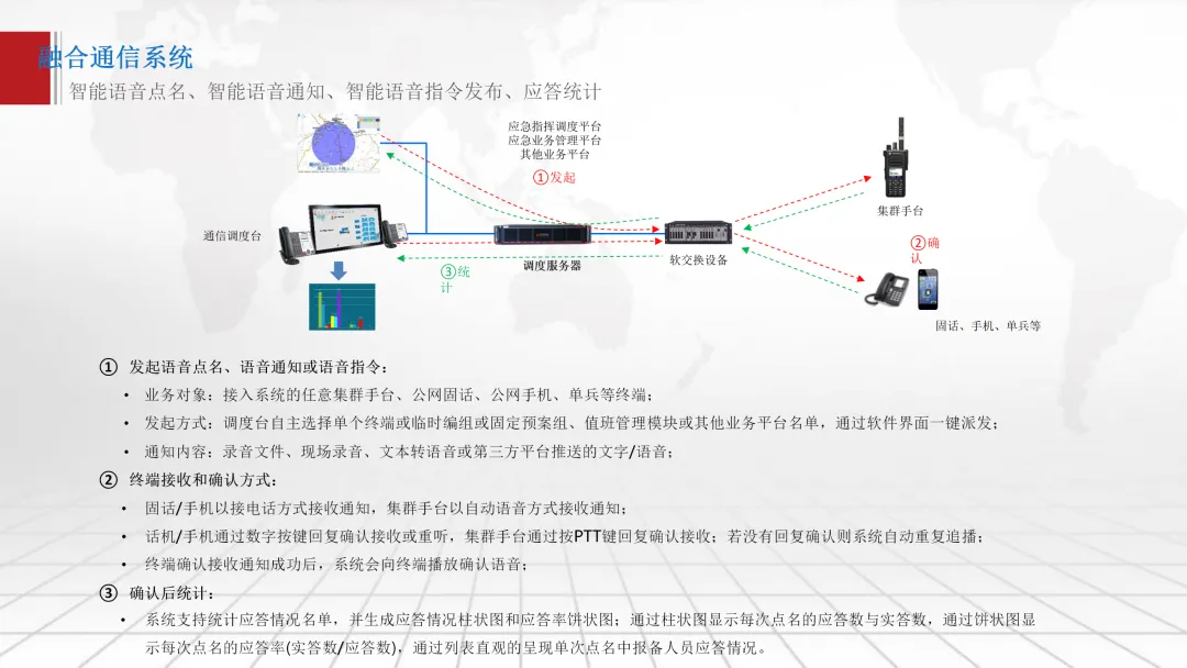融合通信系统还具备智能调度功能。通过智能语音点名、智能语音通知、智能语音指令发布等功能,可以快速、准确地传达应急指令,提升应急指挥的效率和准确性。
