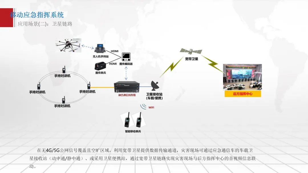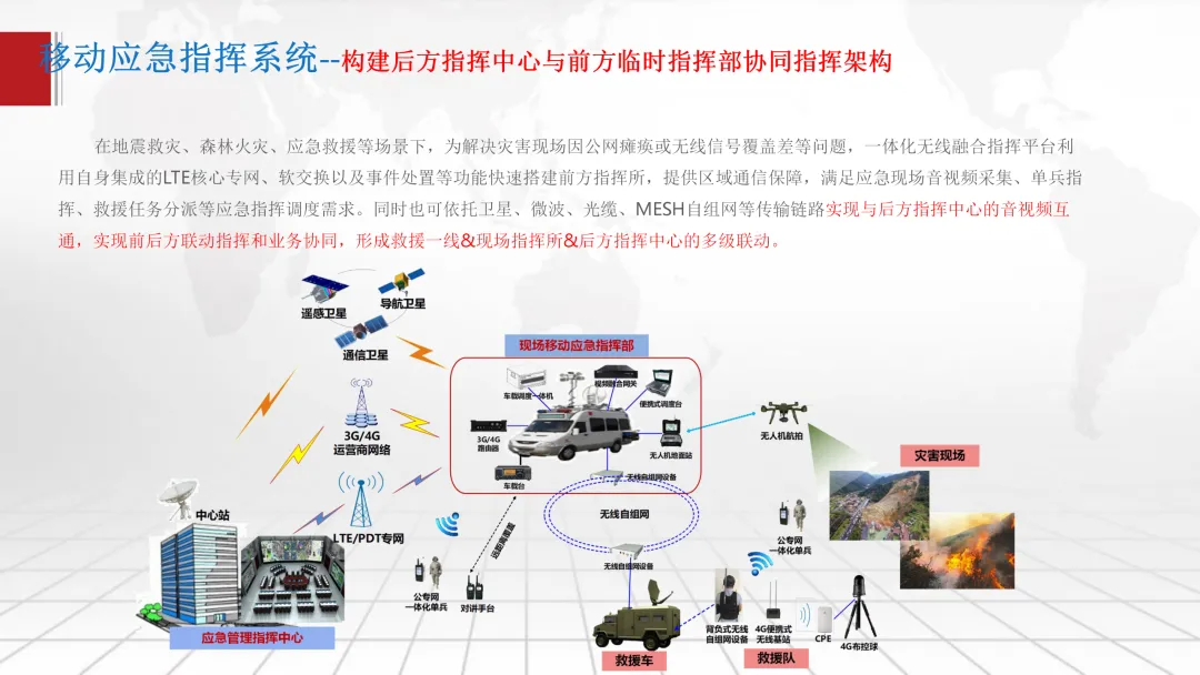 一体化无线融合指挥平台集成了LTE核心专网、软交换以及事件处置等功能,可以快速搭建前方指挥所。通过卫星、微波、光缆、MESH自组网等传输链路,实现与后方指挥中心的音视频互通,形成救援一线&现场指挥所&后方指挥中心的多级联动。
