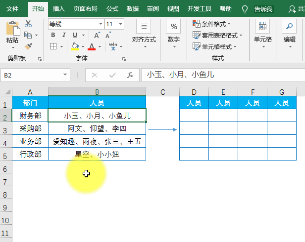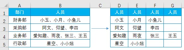 各部门都有多个人员,人员与人员之间是用顿号(、)隔开的,现在要将人员按照顿号(、)分开。