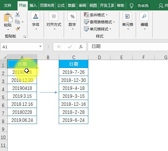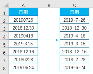 输入的日期不够规范,如下图A列所示,怎样统一日期格式呢?