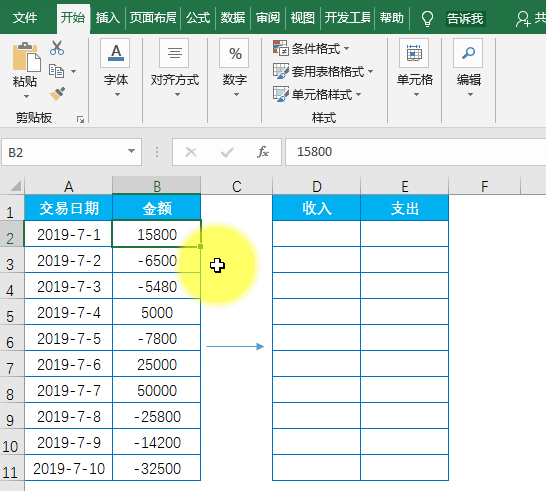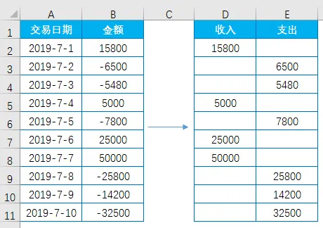 如下图B列所示金额,有正数有负数,怎样将正数显示在收入列、负数显示在支出列呢?