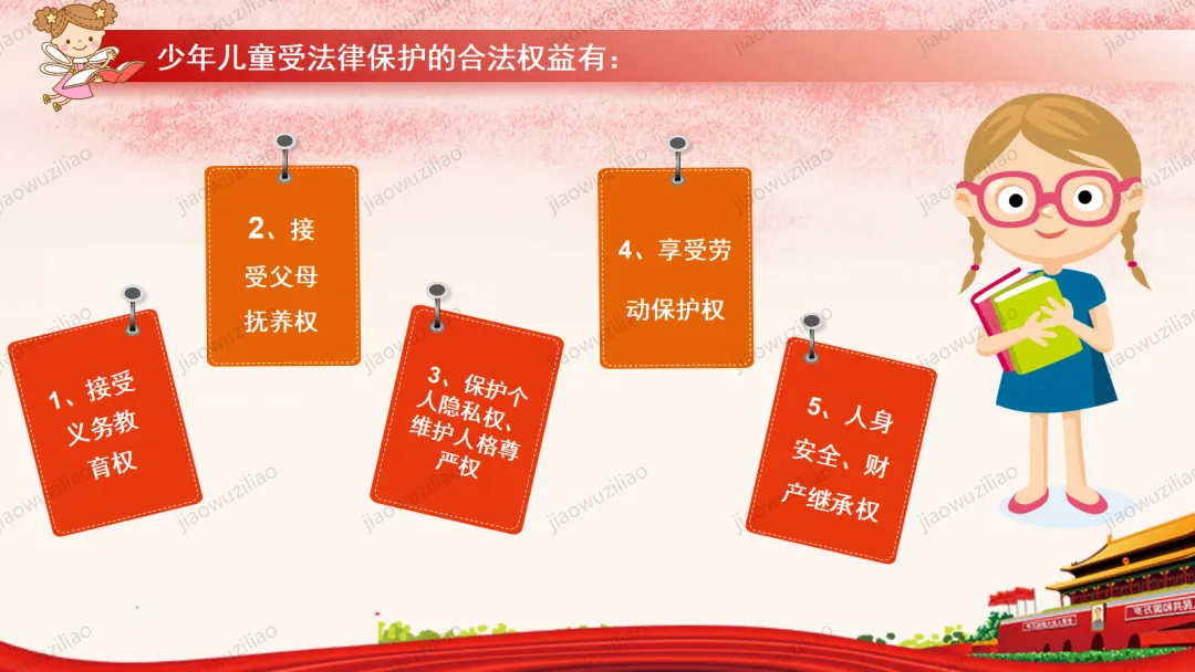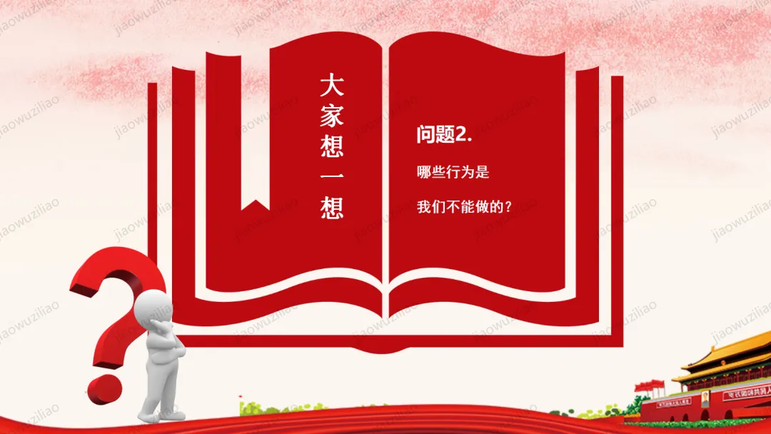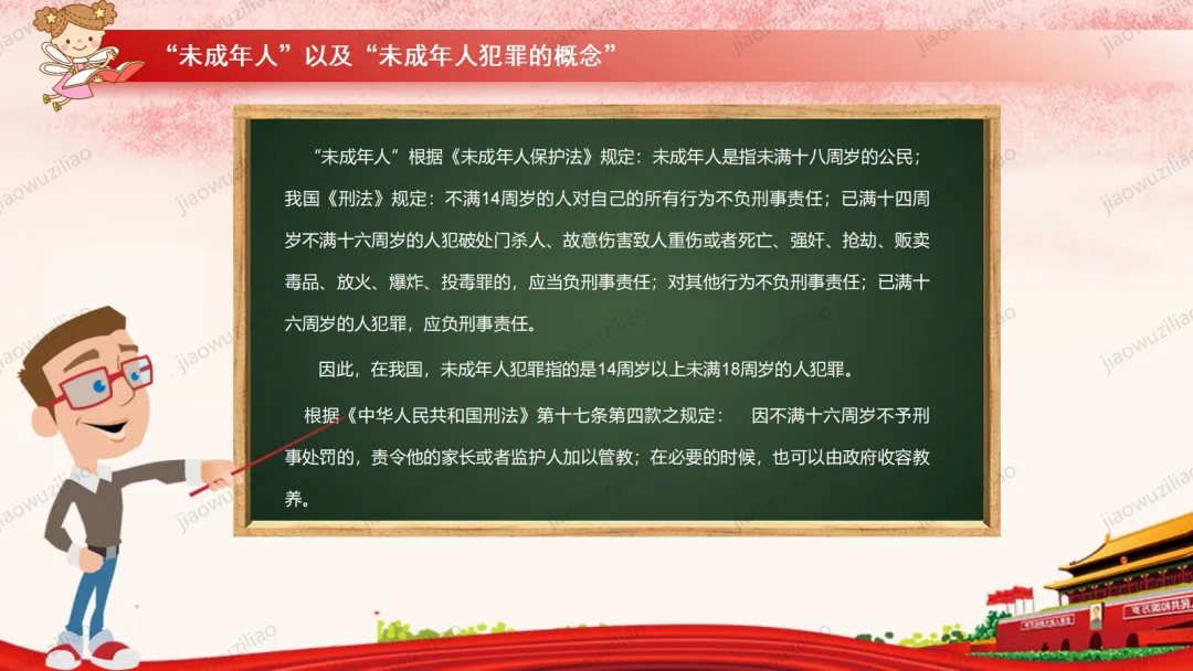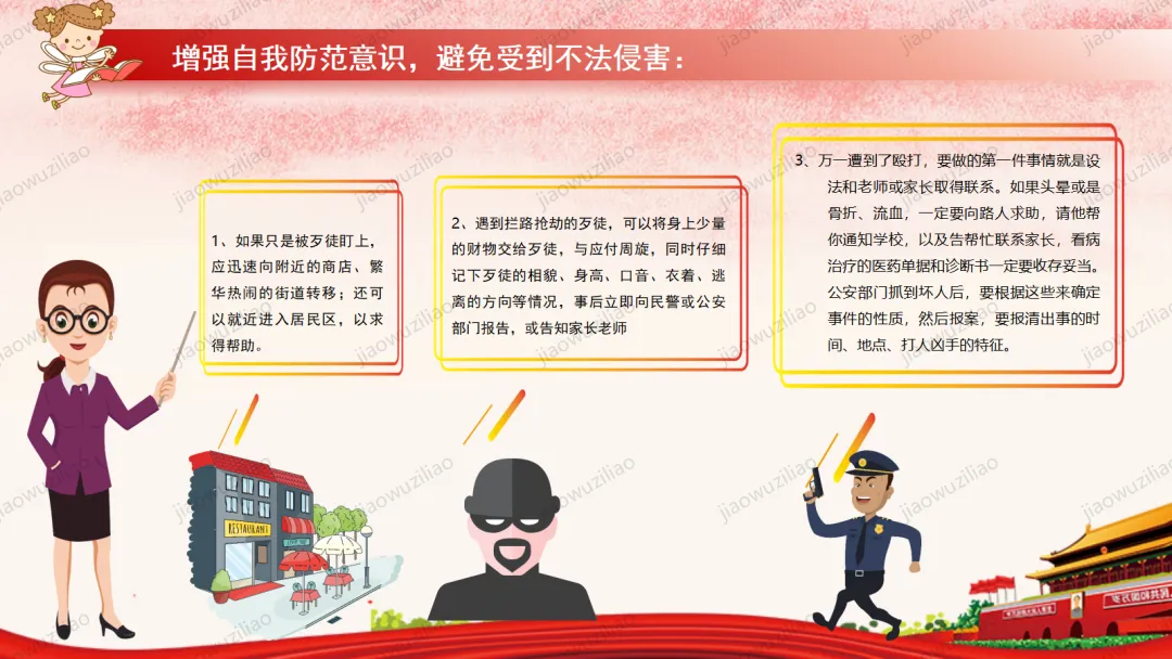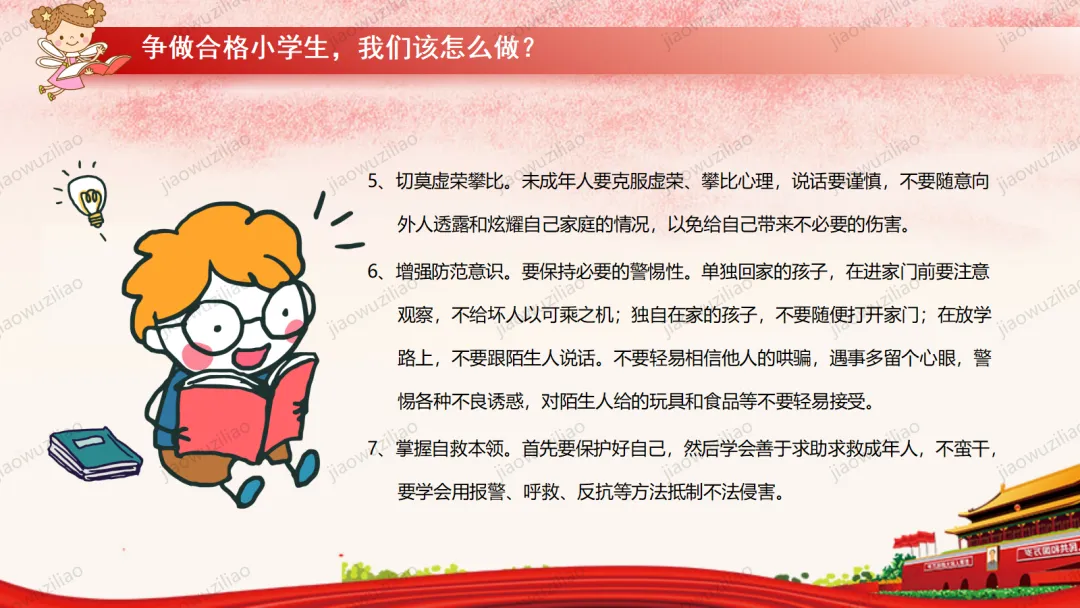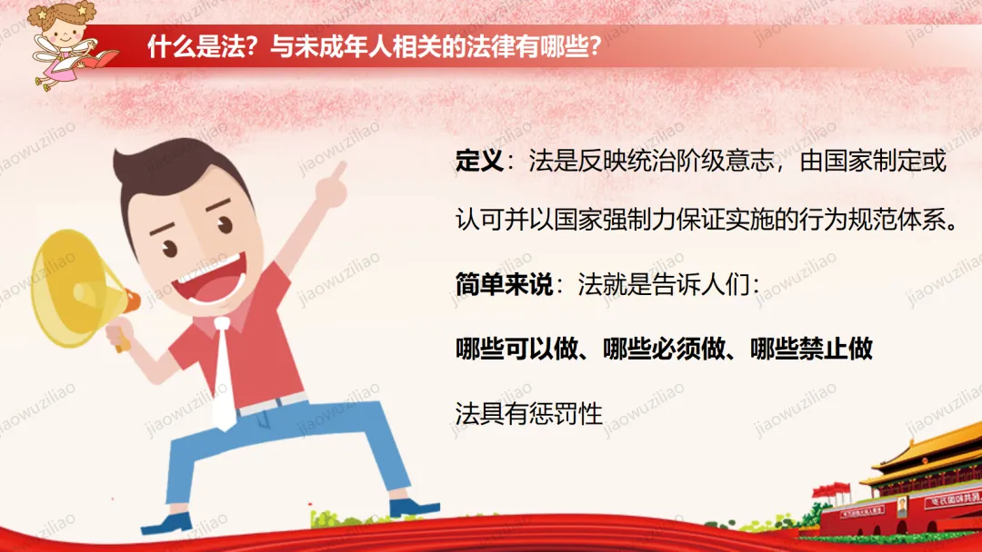 法律是我们成长路上的 “安全卫士”。作为未成年人,我们要从小树立法治意识,遵守校规校纪,知晓基本法律常识。不打架、不欺凌、不沉迷网络,不做危险违法的事。遇到侵害和困难时,及时告诉家长和老师,学会用法律保护自己。争做知法、懂法、守法、用法的新时代好少年。如果您对这篇课件感兴趣,文末有课件的获取方式(PPT无水印,可编辑修改)关注下方卡片公众号有偿获取。(关注后+小编好友,再发课件的编号【3123】或截图。)免责申明:此资料来源于网络公开资源,仅用于学习交流使用,售价为整理资料的费用,我们尊重原创,版权归原作者。,如果侵犯到您的权益,请第一时间联系我们,我们将立即更正或删除相关内容.