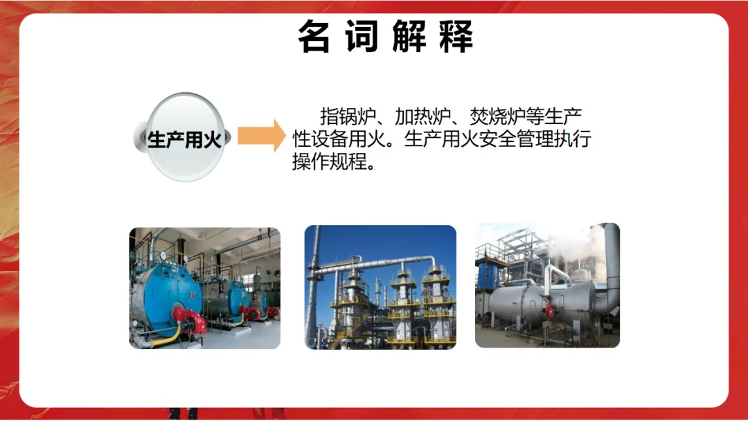 :指锅炉、加热炉、焚烧炉等生产性设备用火。