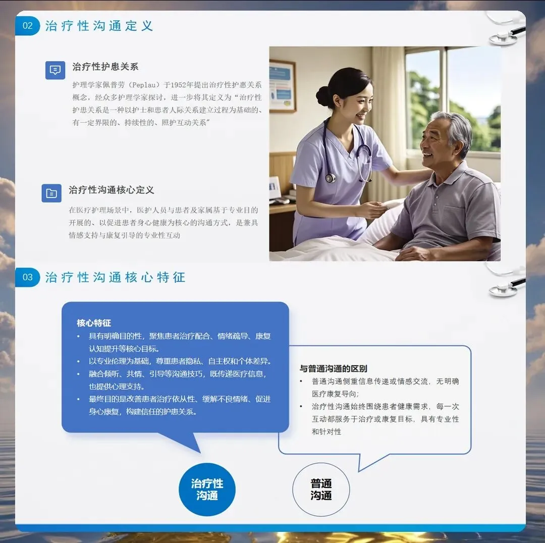 护理学家佩普劳早在1952年就提出了治疗性护患关系的概念。经过几十年的完善,我们现在说的治疗性沟通,就是医护人员与患者及家属基于专业目的开展的,以促进患者身心健康为核心的专业性互动。这种沟通和我们平时聊天的普通沟通有什么区别呢?普通沟通没有明确的康复导向,而治疗性沟通围绕患者的健康需求,具有专业性和针对性,最终目的是帮助患者更好地恢复健康。