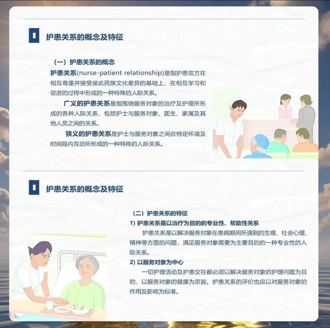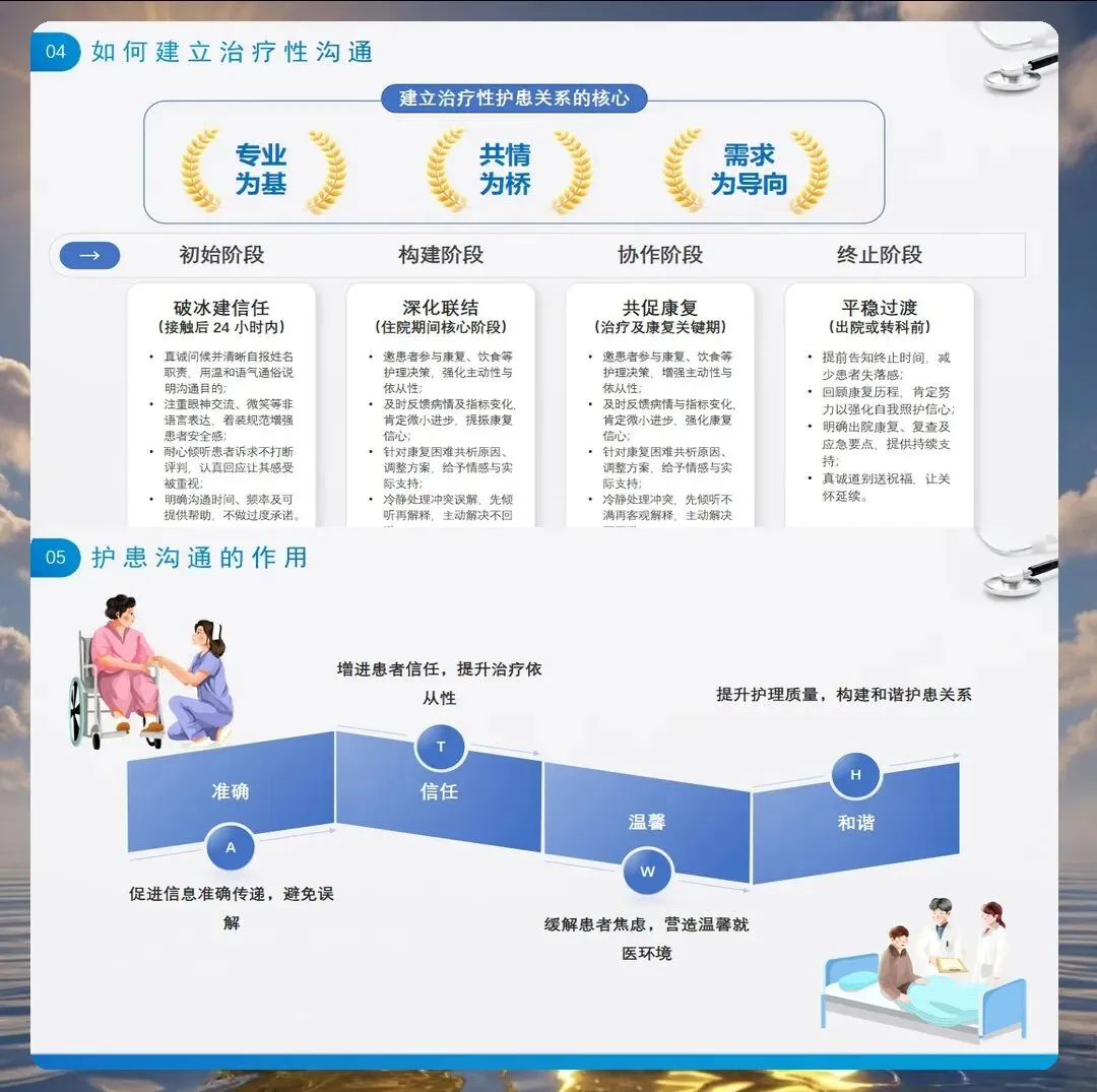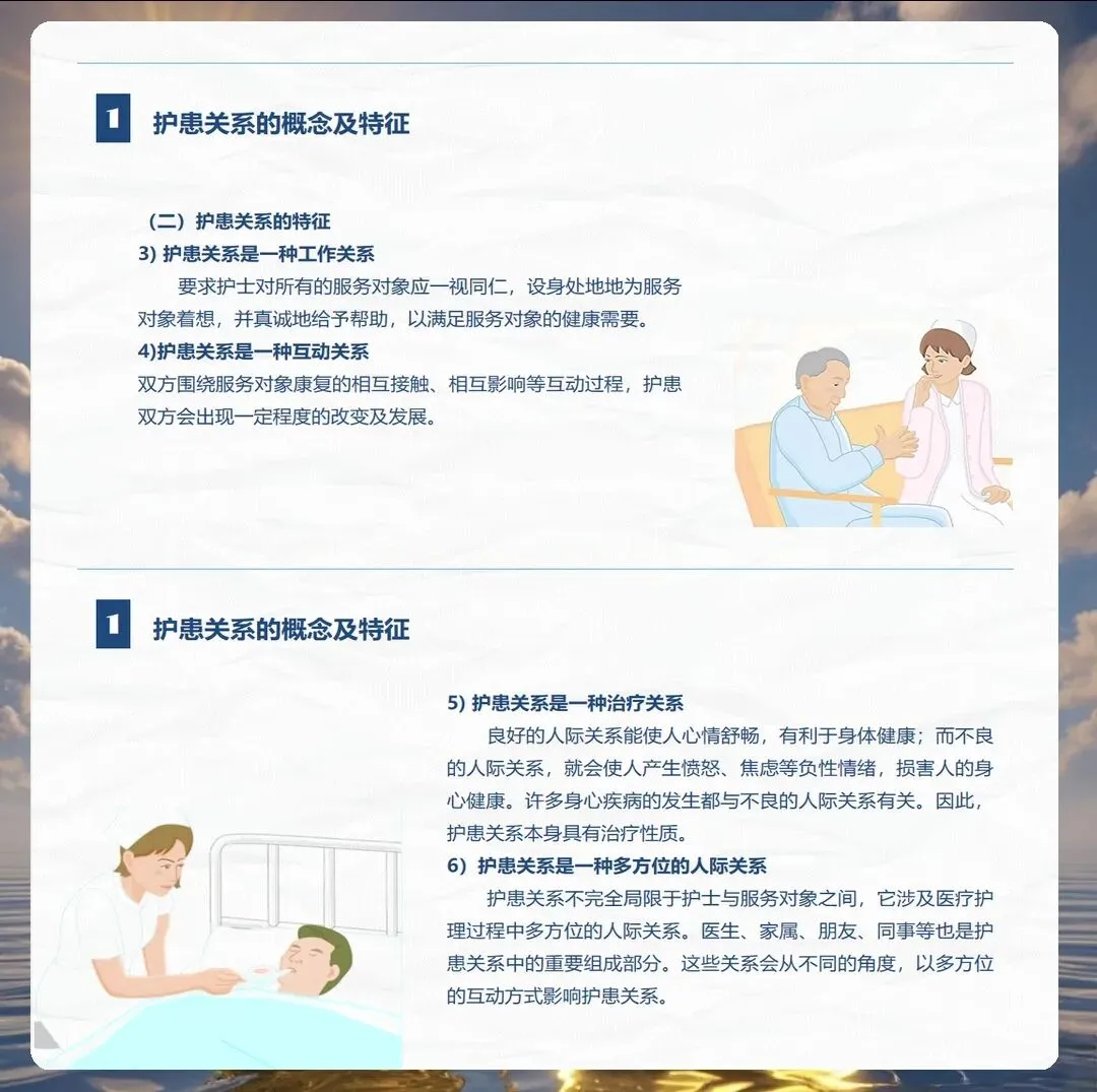 建立治疗性护患关系需要经历四个阶段。初始阶段是在接触后的24小时内,这时候主要是破冰建立信任。患者刚入院时往往紧张不安,我们的一句暖心问候,一个温和的眼神,都能让他们放下戒备。构建阶段是住院期间的核心时期,这时候需要深化与患者的联结。协作阶段是治疗及康复的关键期,我们需要和患者共同努力促进康复。终止阶段是在患者出院或转科前,帮助他们平稳过渡。
