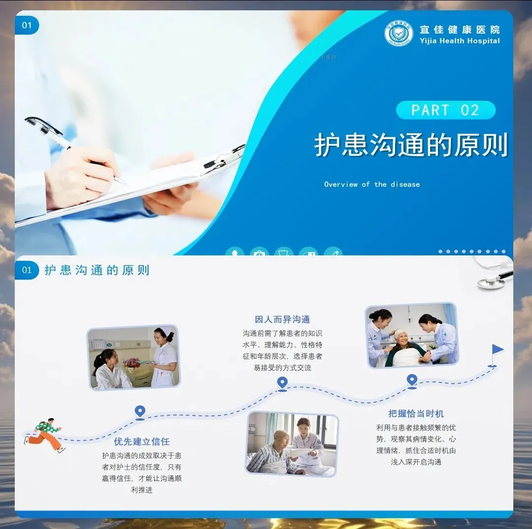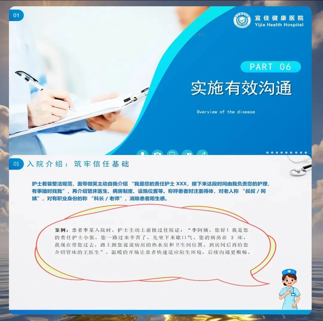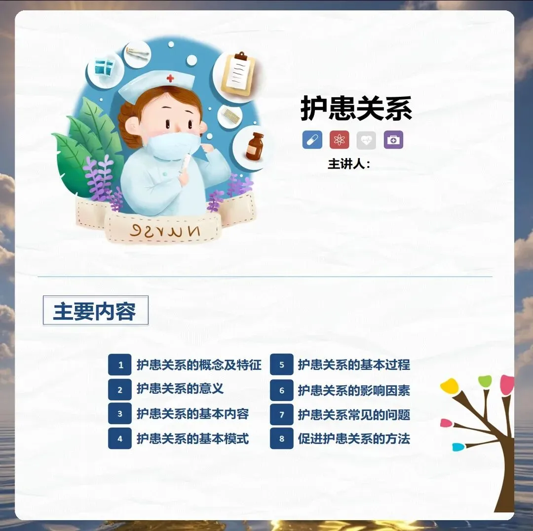 建立治疗性护患关系需要经历四个阶段。初始阶段是在接触后的24小时内,这时候主要是破冰建立信任。患者刚入院时往往紧张不安,我们的一句暖心问候,一个温和的眼神,都能让他们放下戒备。构建阶段是住院期间的核心时期,这时候需要深化与患者的联结。协作阶段是治疗及康复的关键期,我们需要和患者共同努力促进康复。终止阶段是在患者出院或转科前,帮助他们平稳过渡。