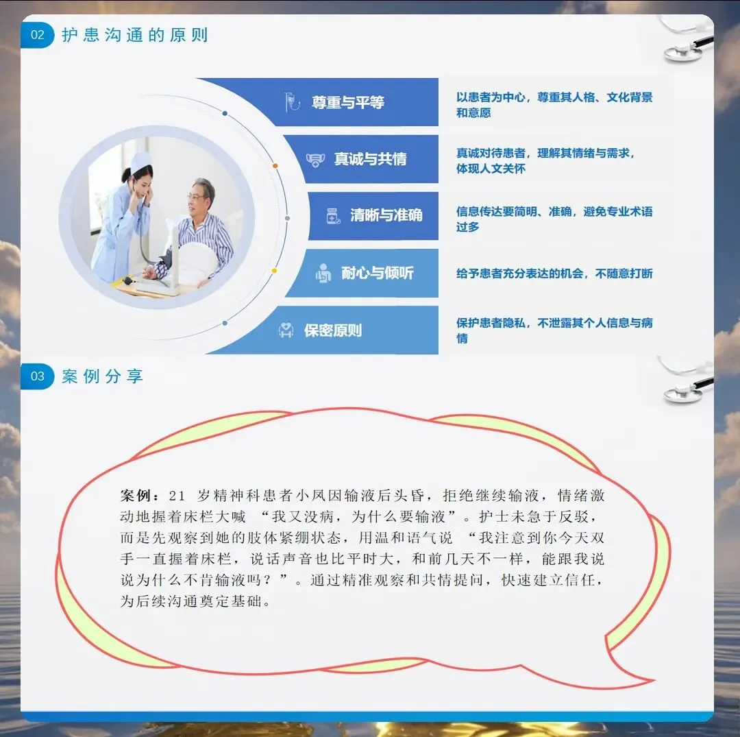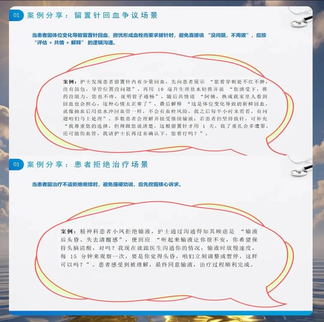 在初始阶段,有位精神科患者的案例很值得我们学习。一个21岁的精神科患者小凤,输液后感到头昏,拒绝继续输液,情绪激动地大喊她又没病为什么要输液。护士没有急于反驳,也没有指责她不配合,而是先观察到她的肢体紧绷状态,然后用温和的语气说,我注意到你今天双手一直握着床栏,说话声音也比平时大,和前几天不一样,能跟我说说为什么不肯输液吗?通过精准的观察和共情式的提问,护士快速建立了信任,为后续沟通奠定了基础。这个案例告诉我们,与其急于解释,不如先理解患者的感受。