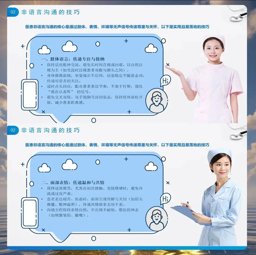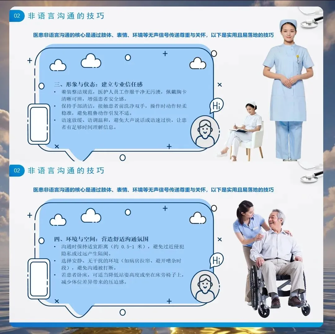 除了语言沟通,非语言沟通同样重要。肢体语言能传递专注与接纳,保持适度的眼神交流很关键,避免长时间直视或回避,以自然注视为主,交流时可以注视患者双眼与额头之间的区域。面部表情则能传递温和与共情,保持适度微笑,尤其在初次接触和安抚情绪时,避免冷漠或过度严肃。