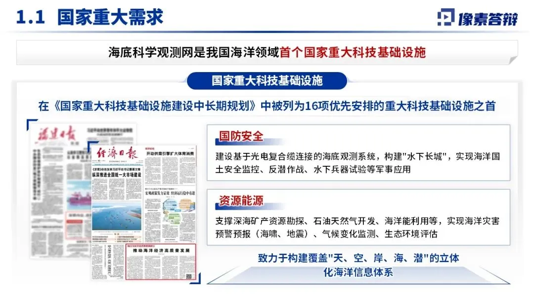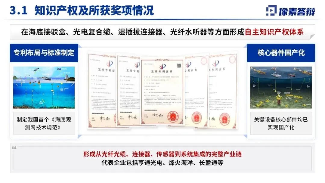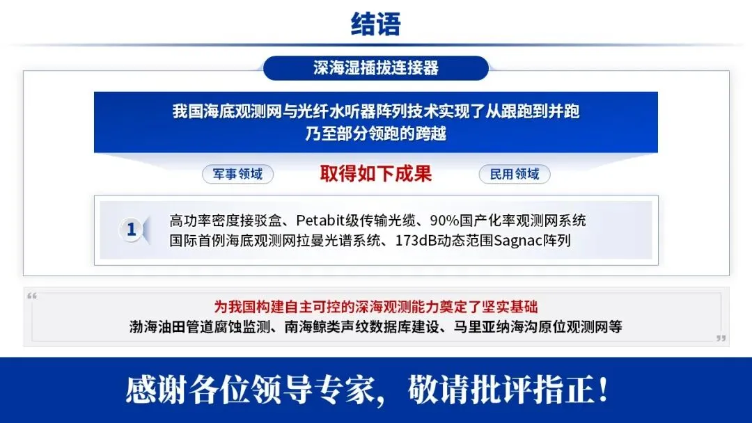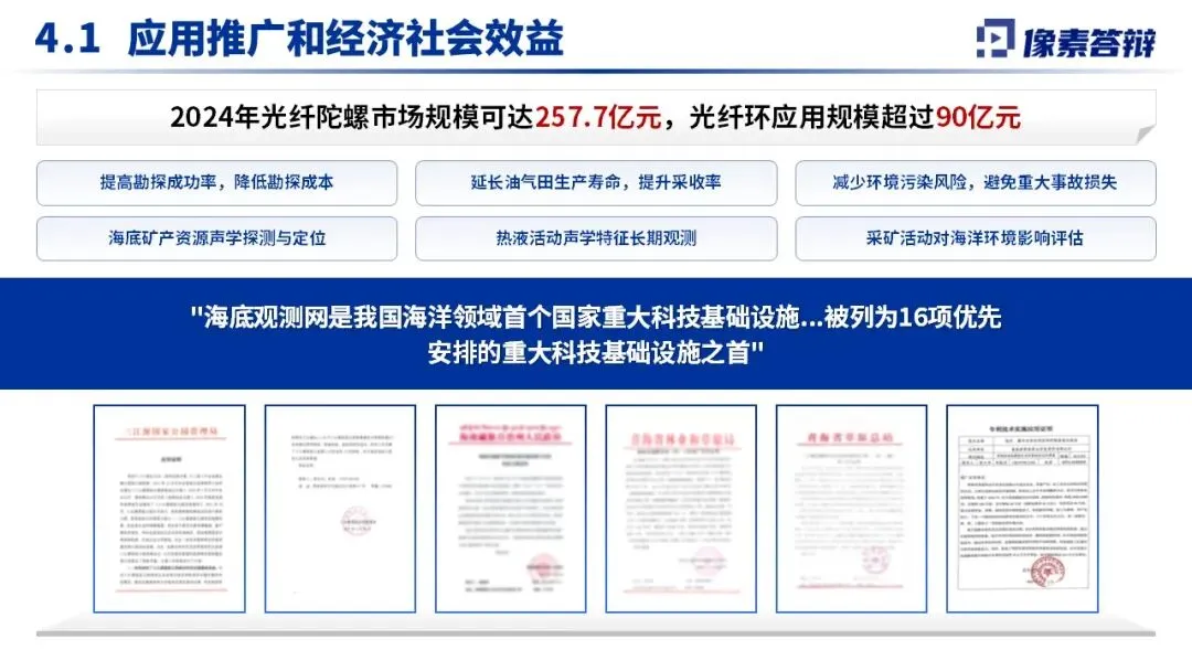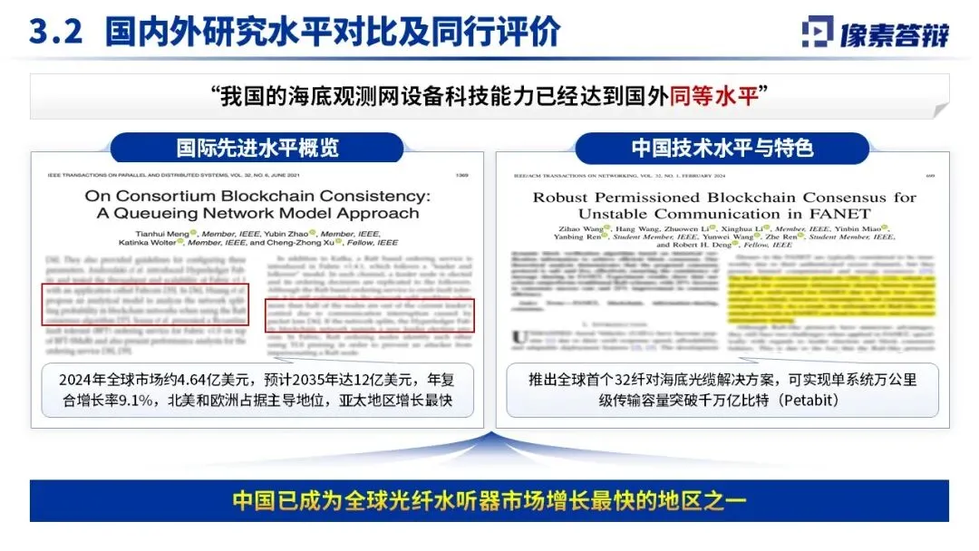 研究形成了自主知识产权体系,制定我国首个《海底观测网技术规范》,核心设备部件国产化率达 90%,打造了完整产业链,技术水平达国际同等,部分领域实现领跑。应用层面覆盖军民用领域,民用上支撑深海矿产、油气资源勘探,提升采收率、降低成本,还应用于渤海油田监测、南海鲸类研究等;军事上助力构建水下安防体系。相关市场规模可观,我国成为光纤水听器全球增长最快地区之一,为我国深海观测能力自主可控奠定坚实基础,实现技术从跟跑到并跑、部分领跑的跨越。