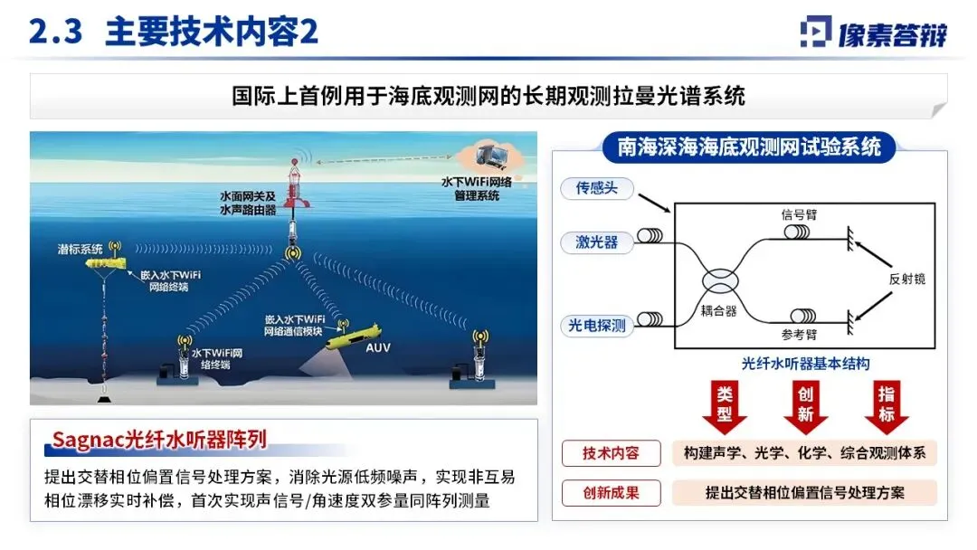 团队突破多项关键技术,实现多维度创新:一是研发出 8000 米水深、25 年稳定运行的海底接驳盒、20kV 耐压湿插拔连接器等核心部件,搭建起海底观测网 “信息高速公路”;二是攻克光纤水听器阵列技术瓶颈,解决低频探测难题,实现单光纤多基元复用,打造出动态范围 173dB 的国内首条四基元 Sagnac 阵列,首次实现声信号 / 角速度双参量同阵列测量;三是研制出国际首例海底观测网长期观测拉曼光谱系统,集成低功耗边缘计算芯片实现数据原位处理,构建多物理场融合观测体系,多款水听器阵列各有性能优势,适配不同应用场景。