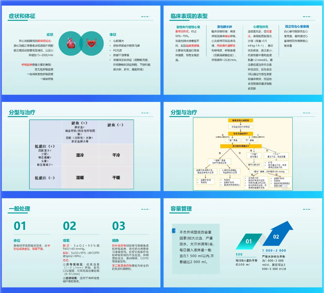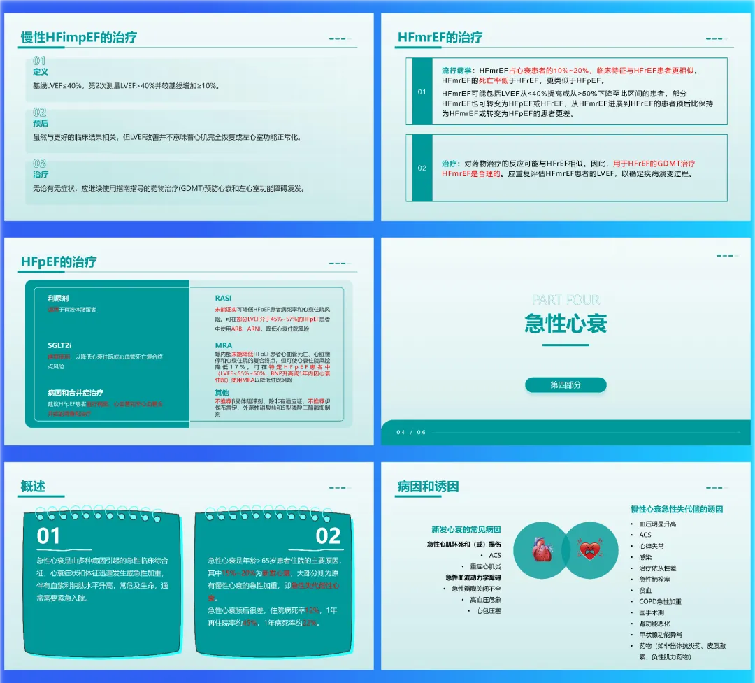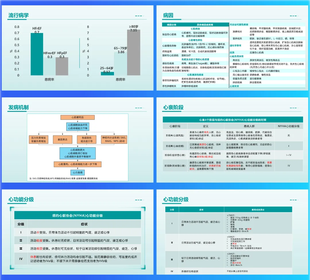 本课件严格遵循临床诊疗路径进行设计,从心衰的定义、分类(HFrEF, HFmrEF, HFpEF, HFimpEF)、流行病学与病因入手,进而详细阐述诊断评估流程、症状体征与各类检查手段,然后以最大篇幅系统性地分章节介绍了慢性HFrEF、HFimpEF/HFmrEF/HFpEF以及急性心衰、右心衰的治疗策略,包括药物、器械及一般治疗,最后补充了合并症的处理,逻辑脉络清晰,覆盖了心衰诊疗的全链条。