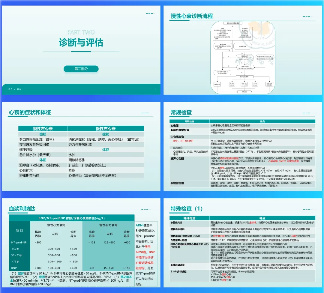 第二部分,诊断与评估:梳理了慢性心衰的诊断流程,列出了左右心衰不同的症状与体征,并详细说明了心电图、胸片、利钠肽(BNP/NT-proBNP)、肌钙蛋白、超声心动图等常规检查,以及心脏磁共振、冠脉造影、心肺运动试验等特殊检查的应用要点与诊断价值。