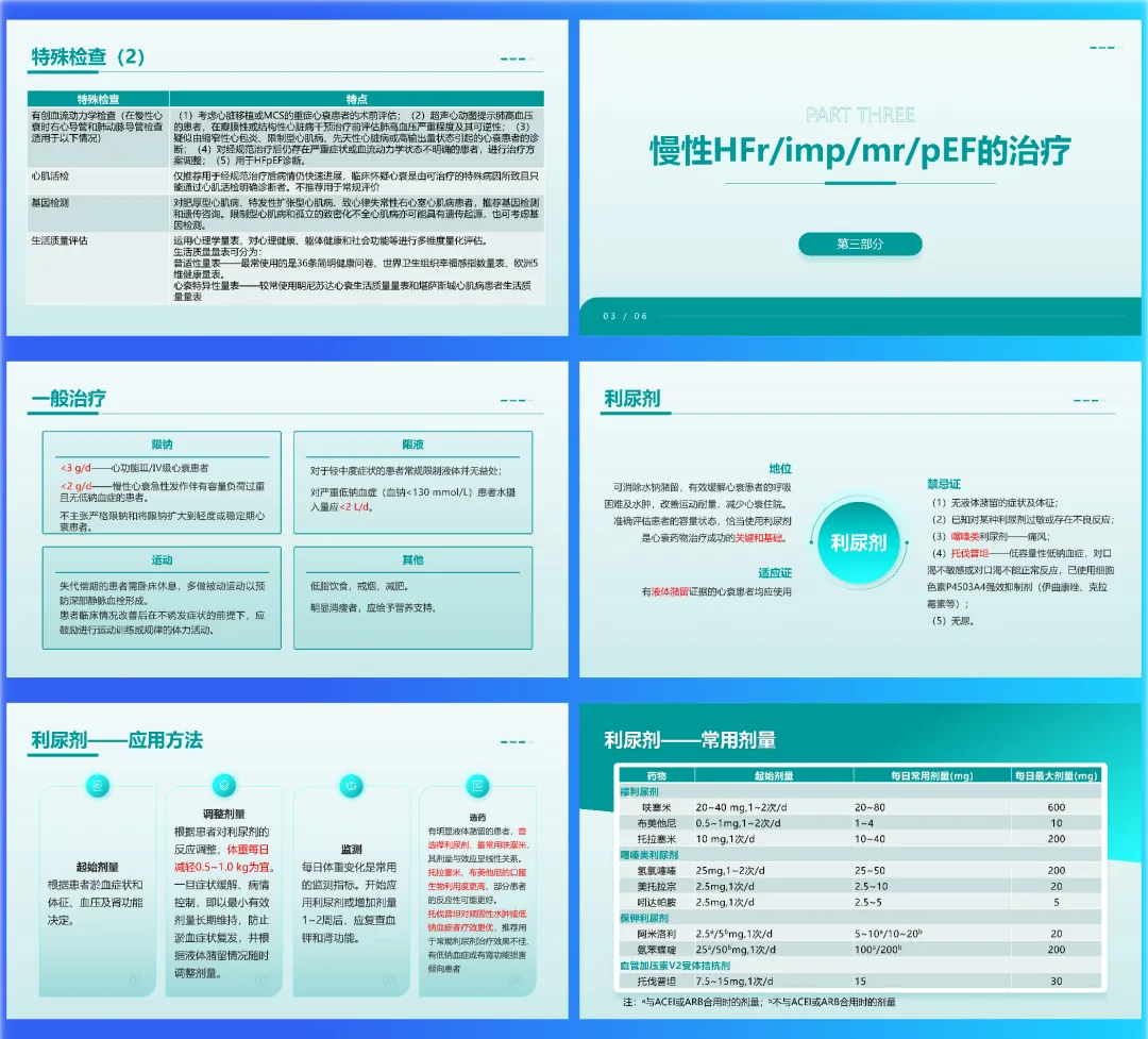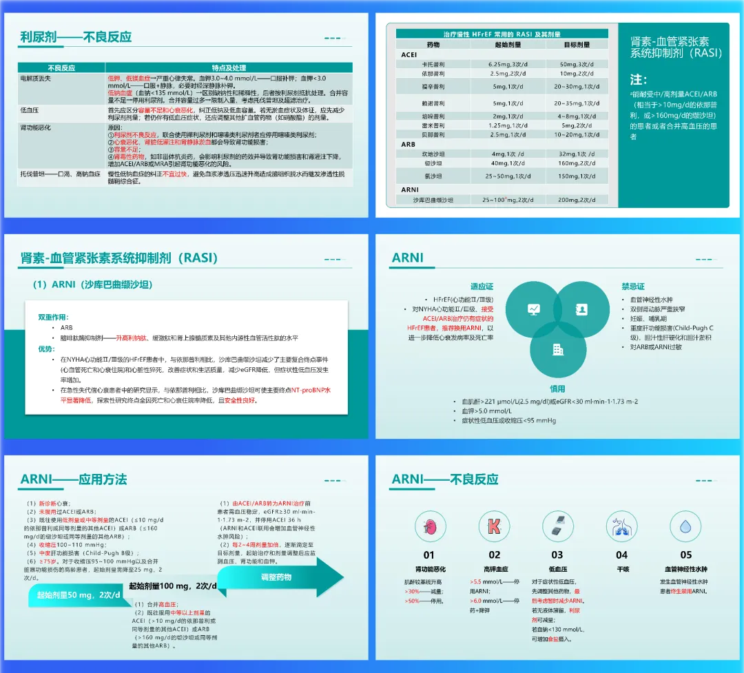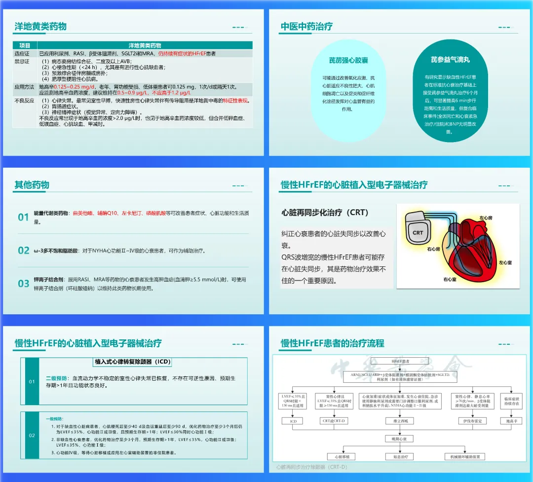第三部分,慢性HFrEF的治疗:这是课件的核心,系统阐述了包括限钠限液、运动在内的基础治疗,并重点介绍了“新四联”基石药物(利尿剂、RASI/ARNI、β受体阻滞剂、SGLT2i)以及MRA、伊伐布雷定、洋地黄等药物的适应证、用法、目标剂量及不良反应,同时涵盖了CRT/ICD器械治疗。