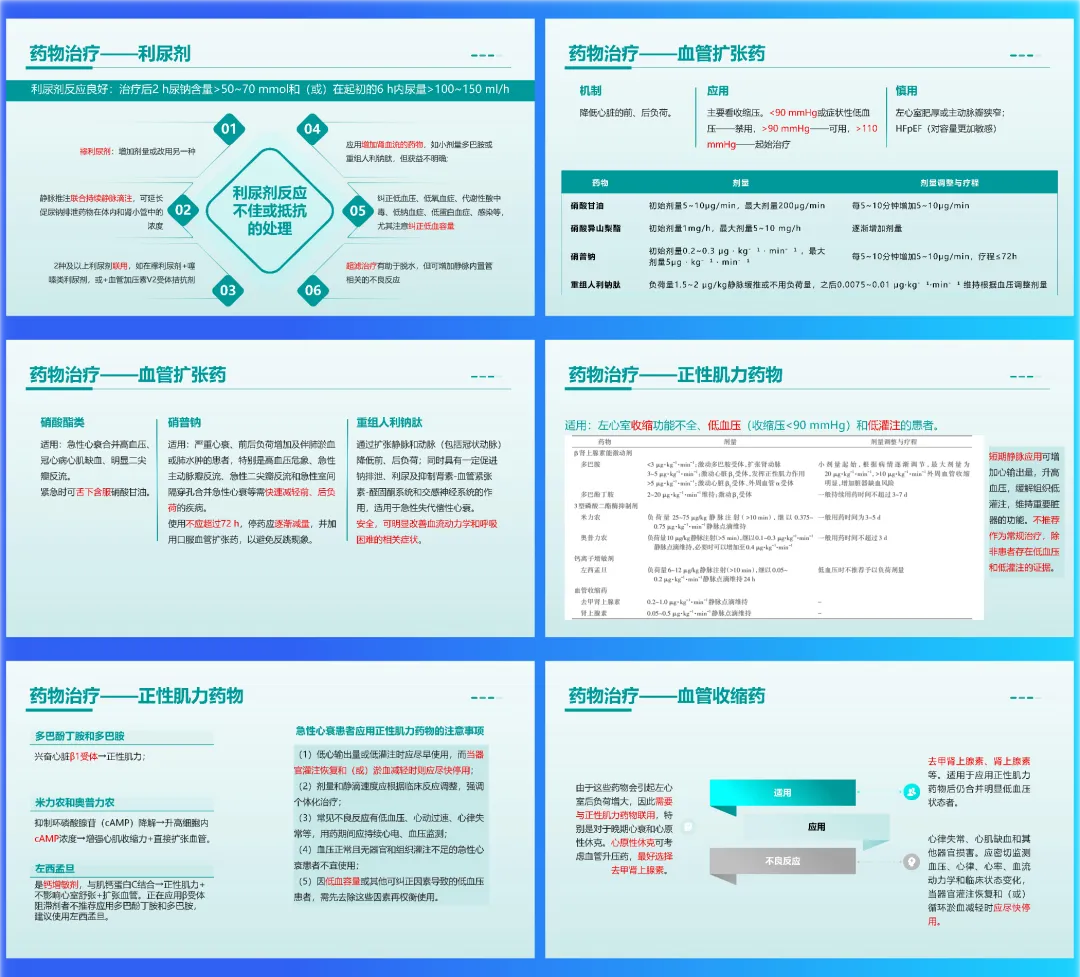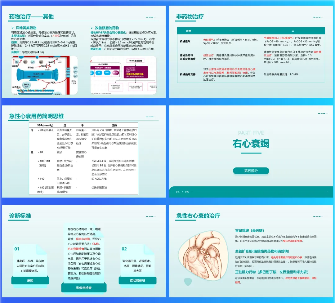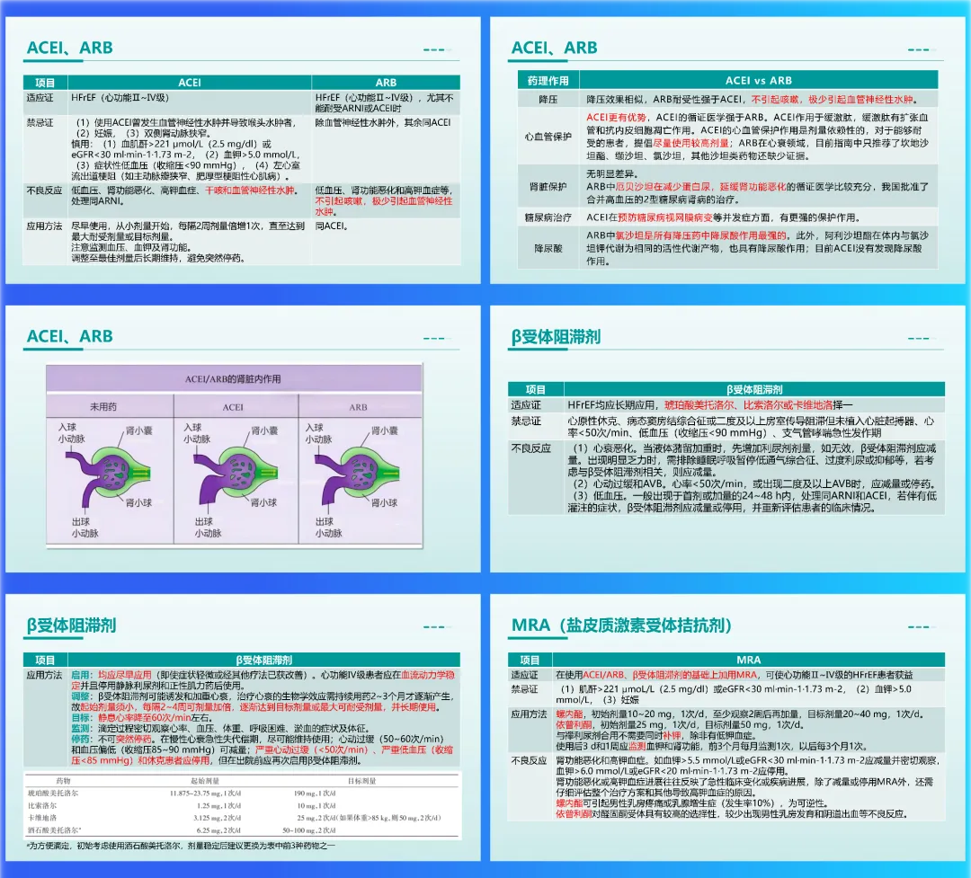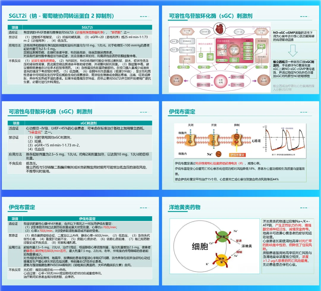 第三部分,慢性HFrEF的治疗:这是课件的核心,系统阐述了包括限钠限液、运动在内的基础治疗,并重点介绍了“新四联”基石药物(利尿剂、RASI/ARNI、β受体阻滞剂、SGLT2i)以及MRA、伊伐布雷定、洋地黄等药物的适应证、用法、目标剂量及不良反应,同时涵盖了CRT/ICD器械治疗。