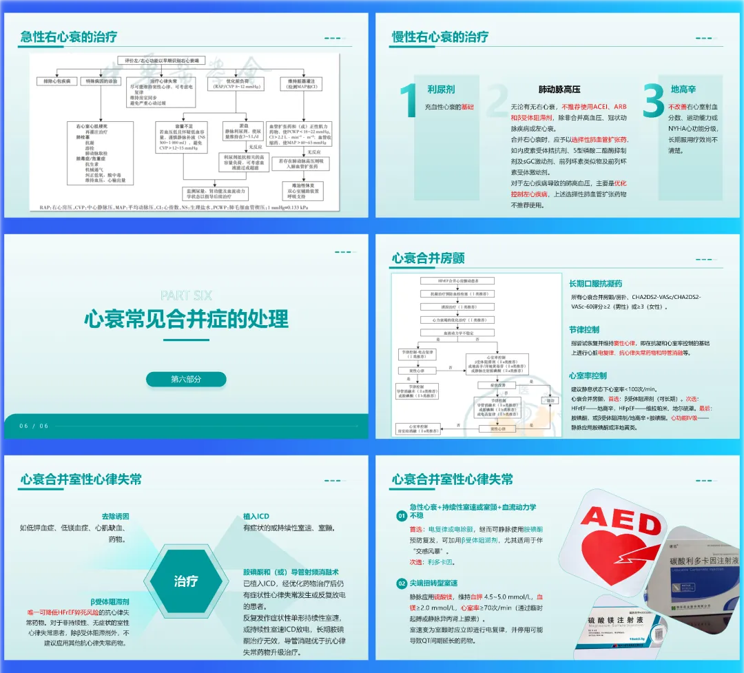 第五部分,右心衰与合并症处理:定义了右心衰的诊断,区分了急慢性右心衰不同的治疗侧重点(急性重容量管理,慢性重利尿)。在合并症部分,重点阐述了心衰合并房颤时的心室率控制、节律控制与抗凝策略,以及合并室性心律失常的处理原则。