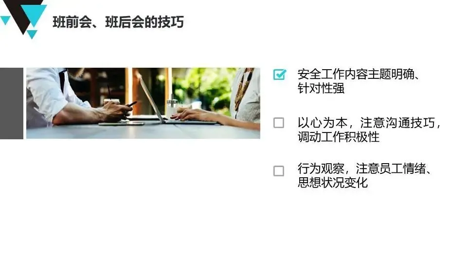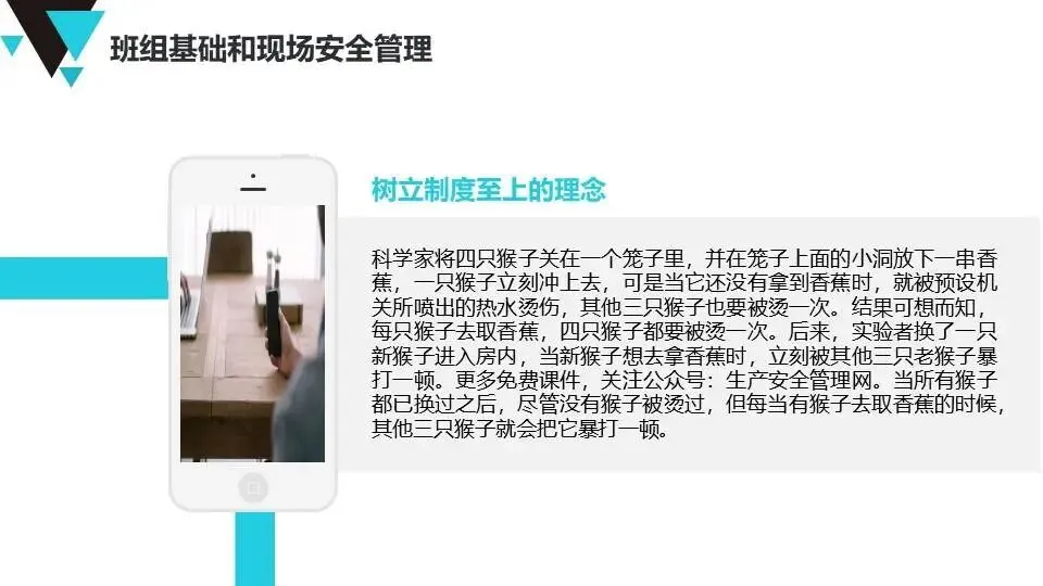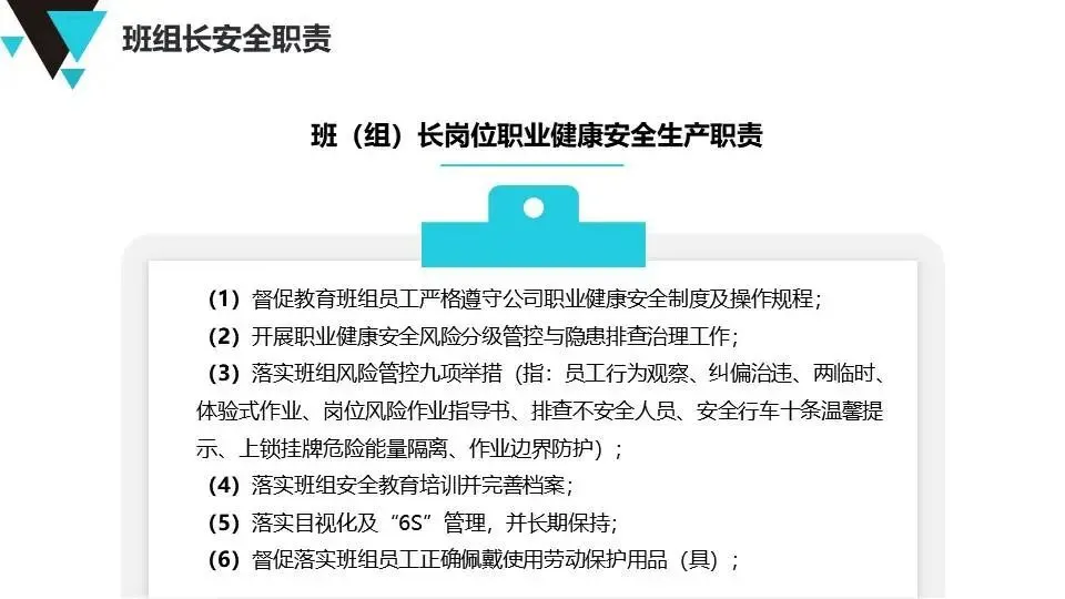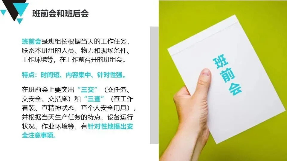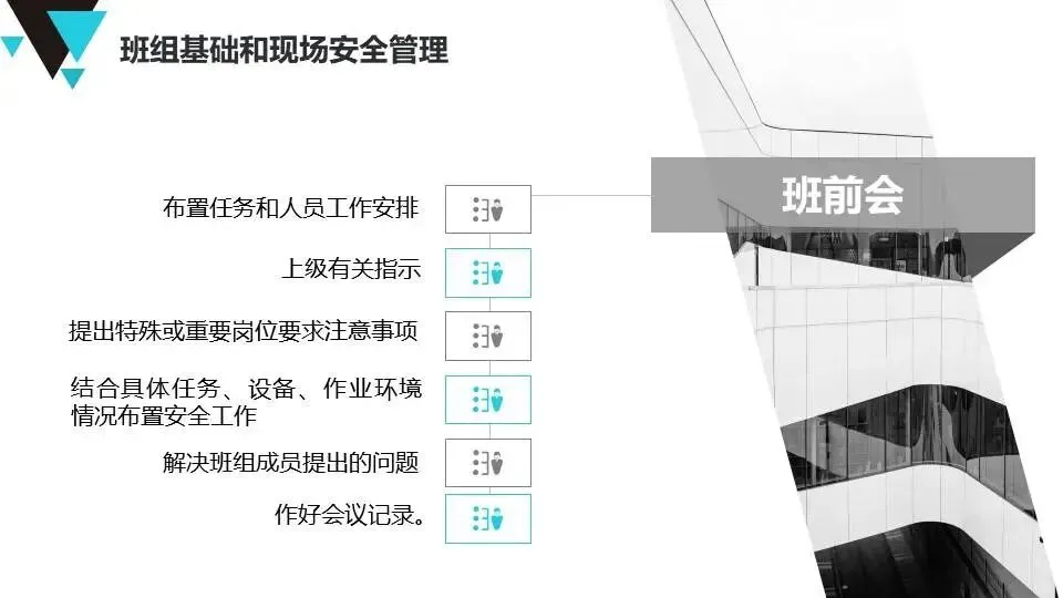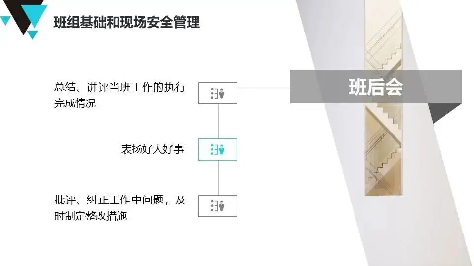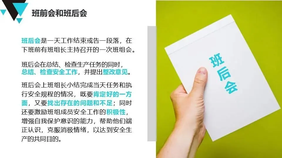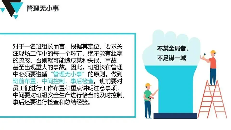 班组安全管理经验:提出“管理无小事”原则,强调班前班后会、安全巡检、员工教育、制度执行等具体方法,注重员工心理健康与激励。