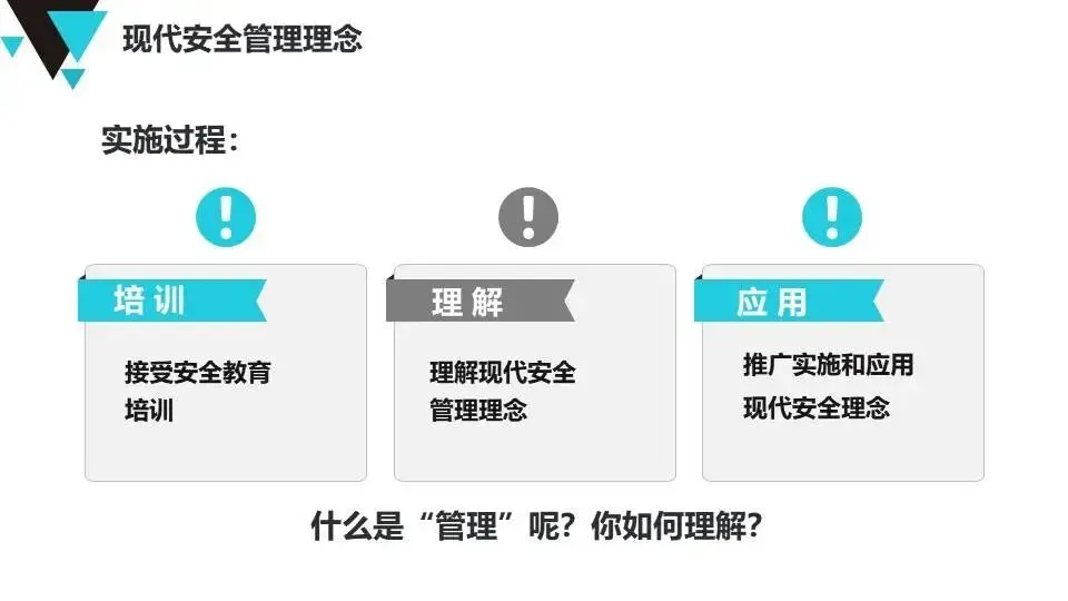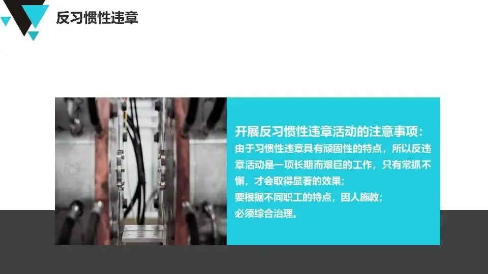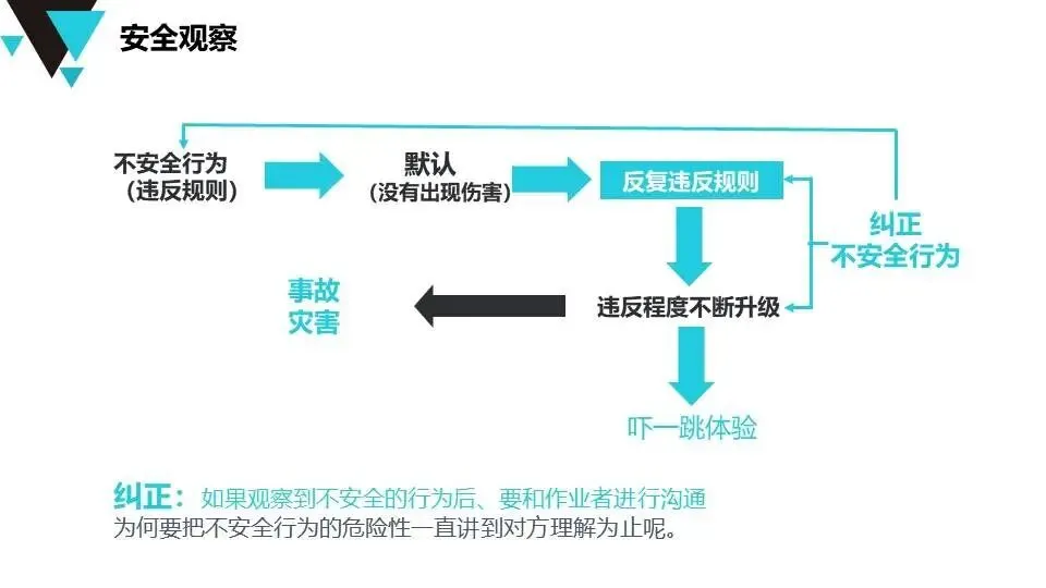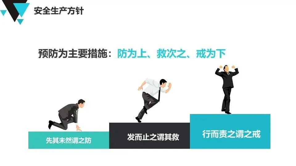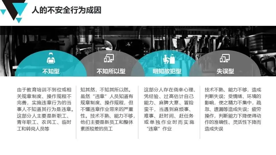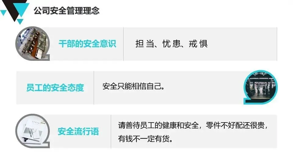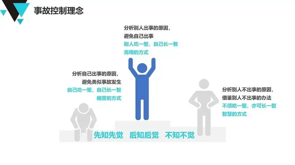 现代安全管理理念:介绍公司安全管理方针、墨菲定律、事故特性(因果性、随机性、潜伏性、可预防性)、事故成因分析及反习惯性违章方法。