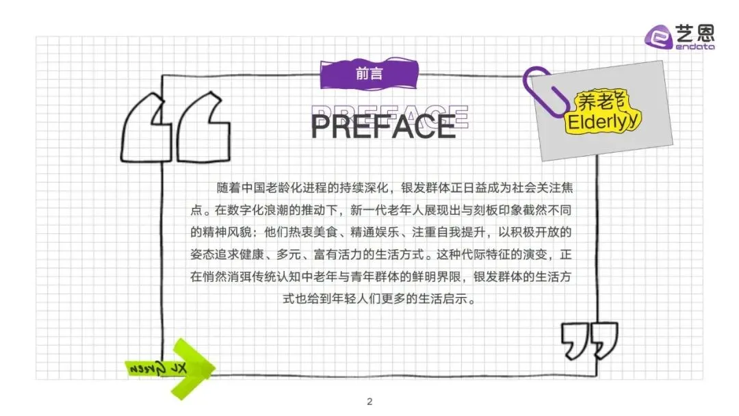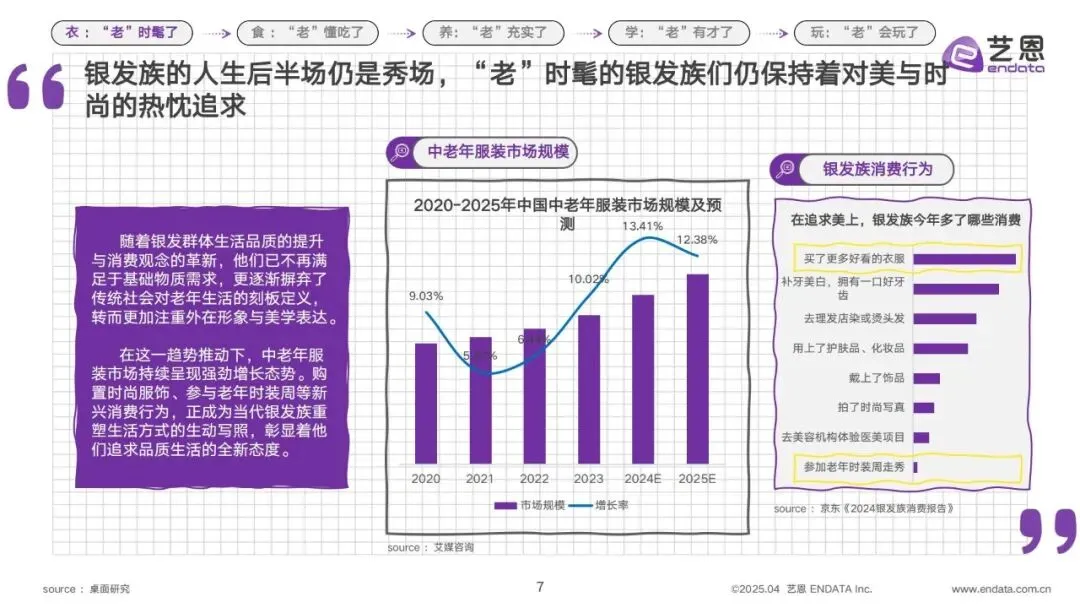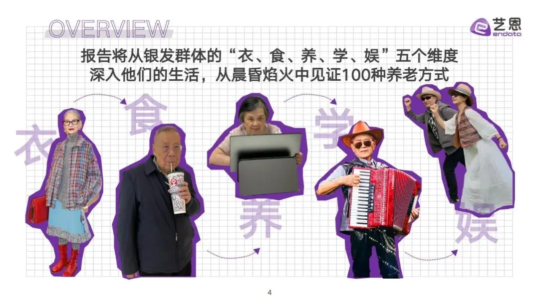 在中国老龄化进程持续深化的当下,银发群体早已摆脱了“暮气沉沉”的刻板印象。2025艺恩《银发群体生活方式图鉴》为我们揭开了新一代老年人的生活真相:他们懂时尚、会尝鲜、爱学习、善玩乐,以积极开放的姿态勾勒出多元且充满活力的养老图景,甚至让不少年轻人直呼“活成了我想要的样子”。预计到2035年左右,我国60岁及以上老年人口比重将超30%,进入重度老龄化阶段,而这届银发族的生活方式,不仅重塑了大众对老年生活的认知,更催生了全新的银发商业趋势。今天,我们就从“衣、食、养、学、娱”五大维度,解锁这届老人的100种养老方式。