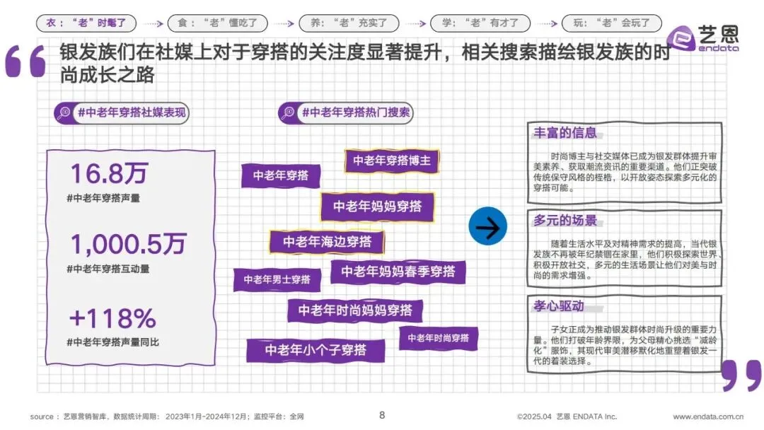 2.社媒赋能,穿搭审美持续进阶。社交媒体成为银发族提升审美、获取潮流资讯的重要渠道,全网#中老年穿搭#话题声量达16.8万,互动量更是突破1000.5万,同比增长118%。中老年妈妈春季穿搭、海边穿搭、男士穿搭等细分话题不断涌现,多元的生活场景让他们的时尚需求持续增强,不再被年龄禁锢穿搭风格。