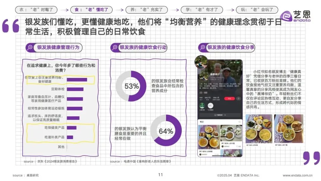2.坚守健康,把营养均衡贯彻到底。懂吃的背后,是银发族对健康饮食的极致追求。64%的银发族认为平衡膳食十分重要并坚持践行,53%的银发族会经常检查食品的营养成分,他们不仅在饮食上注重食材健康,还会通过定期体检、使用家用健康医疗产品等方式管理自身健康。小红书博主“健康真好”凭借分享与老伴的四季健康三餐,收获百万粉丝,成为银发族健康饮食的标杆,也形成了跨代际的情感共鸣。