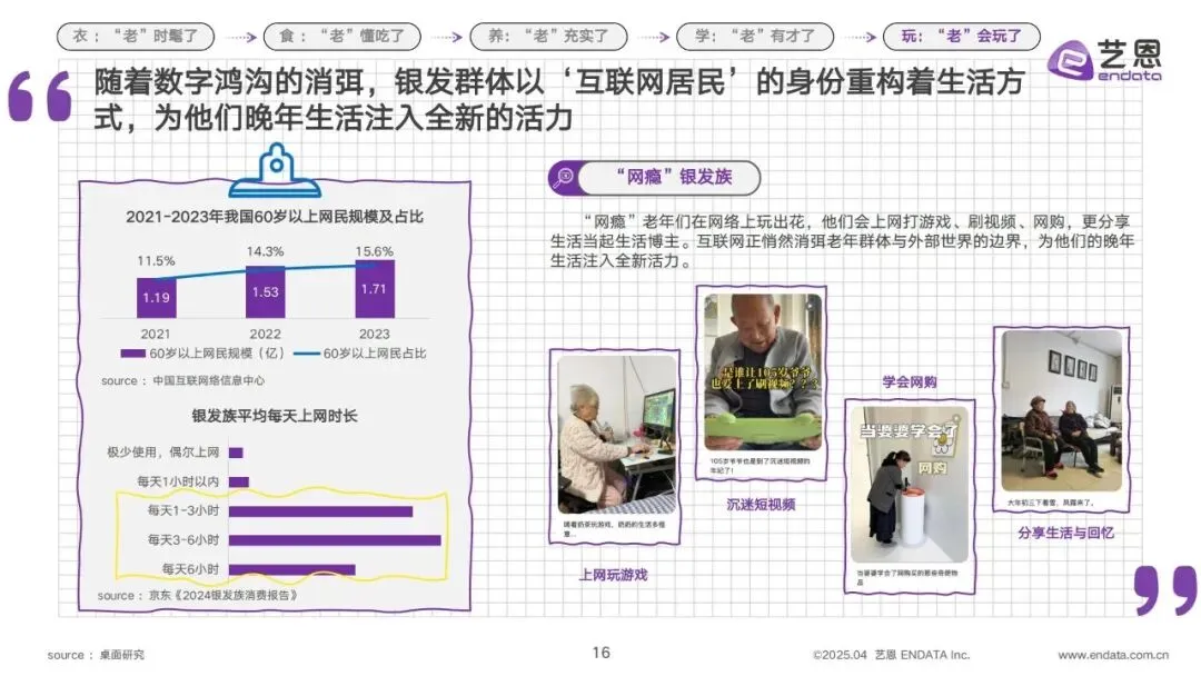 1.玩转互联网,成资深“网瘾”老人。数字鸿沟的逐渐消弭,让银发族成为了真正的“互联网居民”,2021-2023年我国60岁以上网民规模持续增长,2023年达1.71亿,占网民总数的15.6%。他们的上网生活丰富多彩,平均每天上网时长覆盖各个区间,网购、刷短视频、打游戏成为日常,甚至有老人学会上网后成为生活博主,分享自己的养老生活,互联网为他们的晚年生活注入了全新活力。