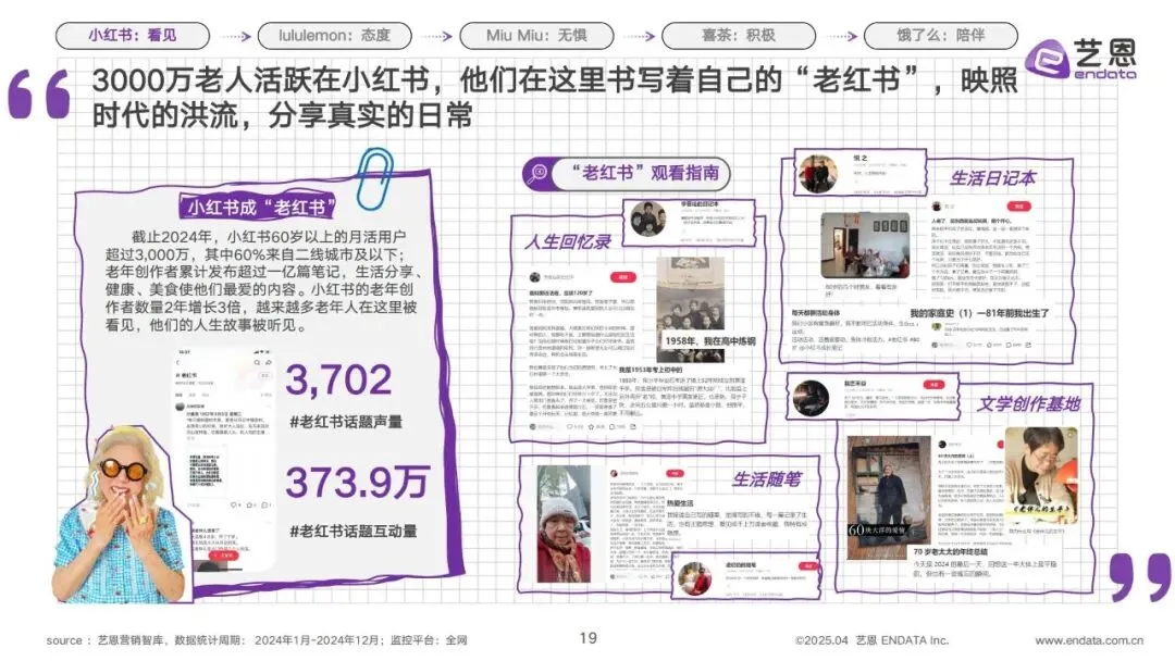 1.小红书:看见银发族的真实生活,打造“老红书”生态。截止2024年,小红书60岁以上月活用户超3000万,60%来自二线城市及以下,老年创作者累计发布超一亿篇笔记,生活分享、健康、美食是他们最爱的内容,创作者数量2年增长3倍。平台推出《小红书使用手册》优化银发族使用体验,打造“老红书”内容矩阵,让更多银发族的人生故事被看见、被听见,#老红书#话题也成为平台热门,形成了独特的银发内容生态。