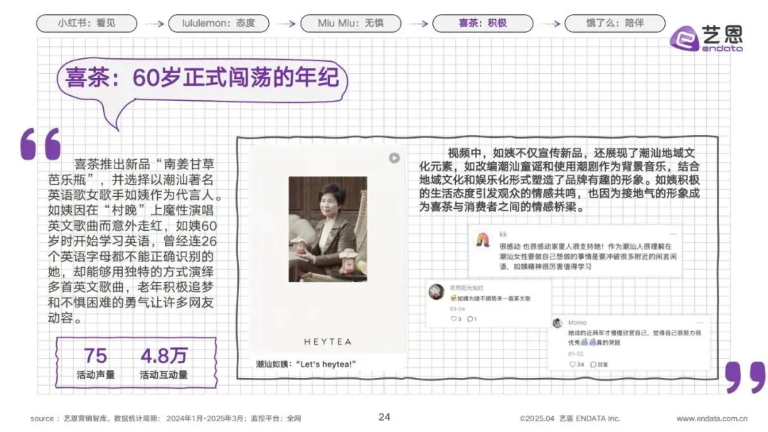 4.喜茶:拥抱银发积极力量,打造地域与情感共鸣。新消费品牌喜茶推出新品“南姜甘草芭乐瓶”,选择60岁开始学习英语、因演唱英文歌曲走红的潮汕如姨作为代言人。如姨不惧困难、老年追梦的勇气打动了无数网友,而喜茶的营销视频中,还融入了潮汕童谣、潮剧等地域文化元素,让品牌形象更加接地气,也成为连接品牌与消费者的情感桥梁,实现了品牌与银发族的深度共鸣。