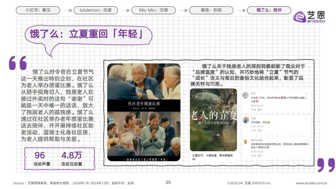 5.饿了么:以陪伴为核心,传递品牌温度。饿了么从独居老人的情感需求出发,在立夏节气推出特别企划,以骑手视角展现独居老人的孤独感,并在社区为老人举办掼蛋比赛,开展持续的社区助老活动,让蓝骑士化身社区侠,为老人送去陪伴与关爱。品牌将立夏的“成长”含义与食俗文化结合,用充满烟火气的活动刷新了大众对“品牌温度”的认知,也让银发族感受到了来自商业品牌的暖心关怀。