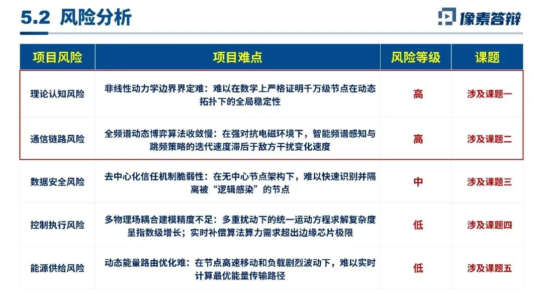 既突出项目的国家战略契合性,紧扣相关产业发展规划,明确项目对高阶自动驾驶、智能交通等领域的技术支撑价值;又直面技术、管理、外部三类核心风险,明确风险涉及课题与等级,体现项目规划的全面性与科研团队的严谨性,符合申报评审的核心考察维度。