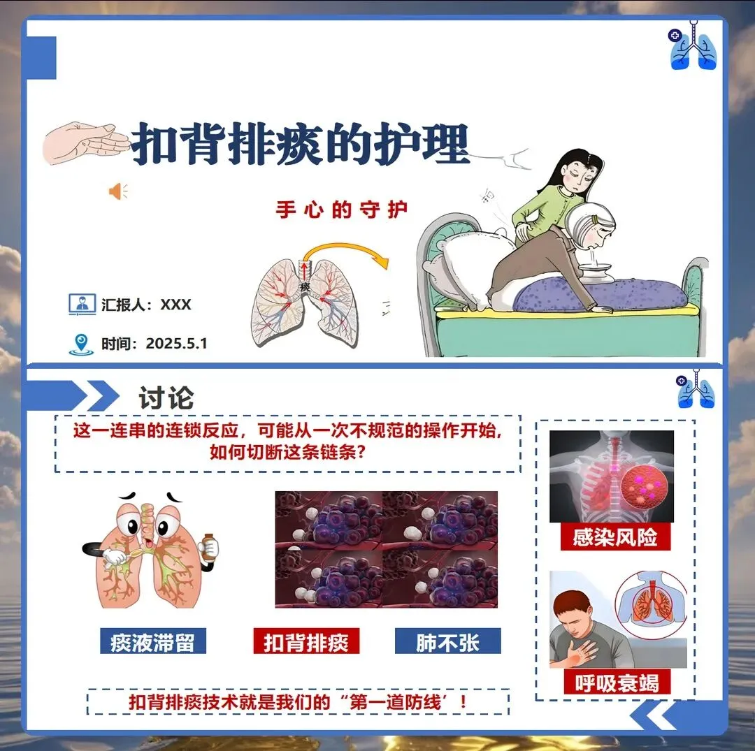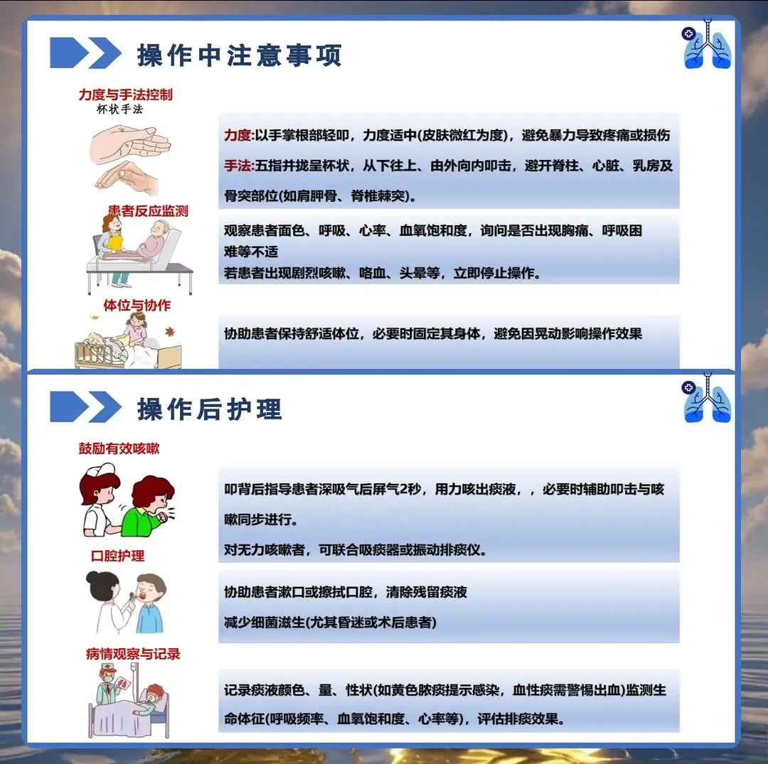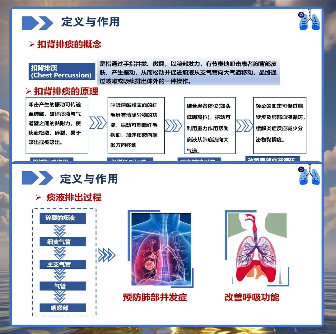 在临床护理工作中,气道管理是患者康复过程中的重要环节,而扣背排痰作为保持呼吸道通畅的基础护理技术,其操作的规范性直接影响患者的康复效果。然而在实际工作中,部分护理人员对扣背排痰的时机选择、手法掌握、禁忌症识别等方面仍存在认识偏差。今天结合临床实践经验,与大家深入探讨扣背排痰的正确护理要点。