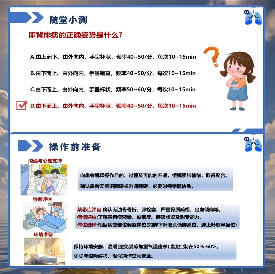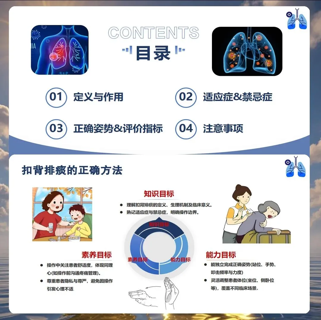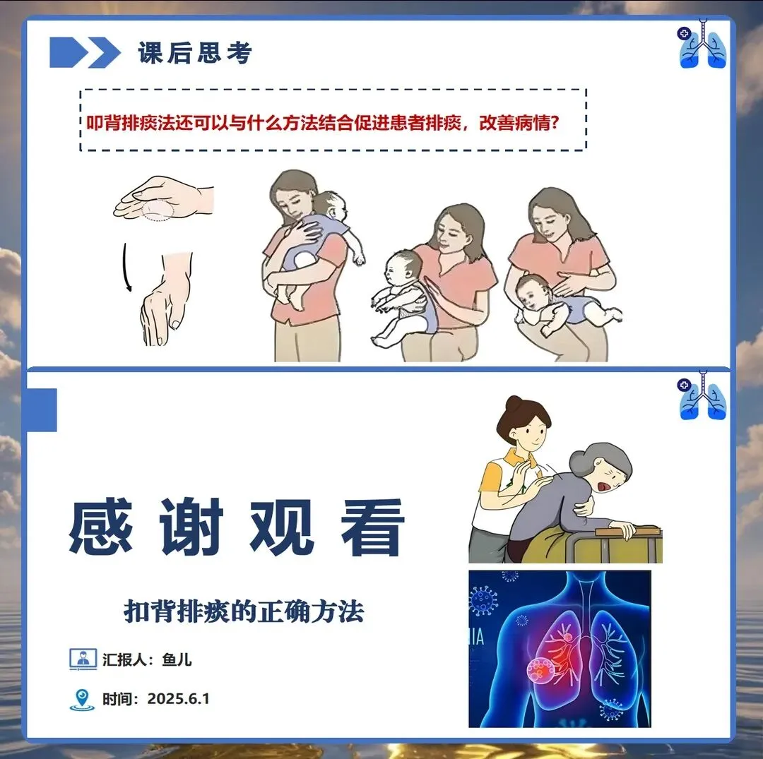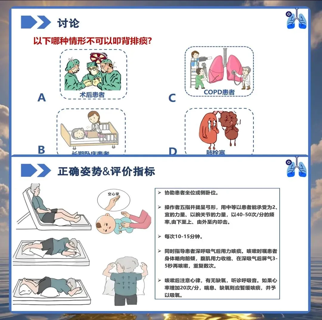 在临床护理工作中,气道管理是患者康复过程中的重要环节,而扣背排痰作为保持呼吸道通畅的基础护理技术,其操作的规范性直接影响患者的康复效果。然而在实际工作中,部分护理人员对扣背排痰的时机选择、手法掌握、禁忌症识别等方面仍存在认识偏差。今天结合临床实践经验,与大家深入探讨扣背排痰的正确护理要点。