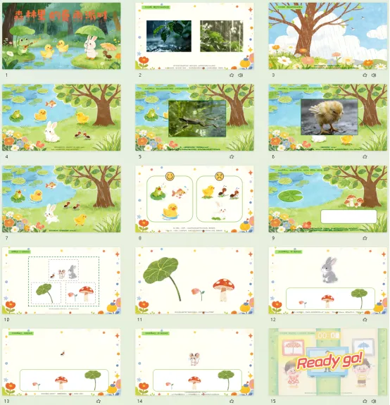 l课件准备:《森林里的春雨派对》课件。