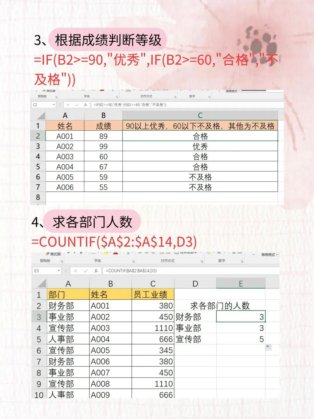 场景:给员工绩效打分、考试成绩分等级公式:=IF(B2>=90,"优秀",IF(B2>=60,"合格","不及格"))👉 90 分以上标优秀,60-89 合格,60 以下不及格,一键批量搞定!4️⃣ 数各部门人数:COUNTIF