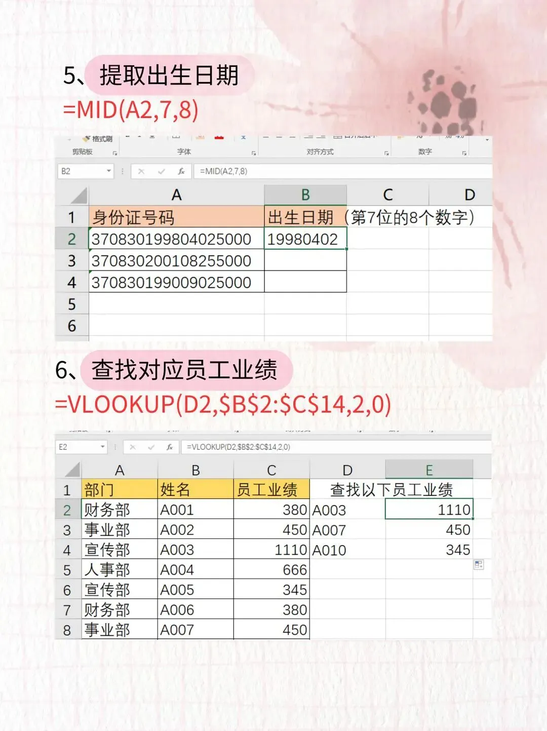 场景:做员工档案,从 18 位身份证号里挖生日公式:=MID(A2,7,8)👉 第 7 位开始取 8 个数字,就是 YYYYMMDD 格式的生日,超方便!6️⃣ 快速查对应数据:VLOOKUP