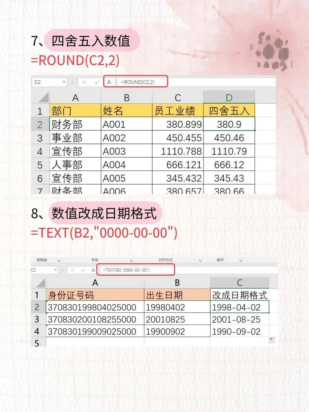 场景:业绩、提成要保留 2 位小数公式:=ROUND(C2,2)👉 后面的数字 2 就是保留 2 位小数,想留几位就改几,整齐又好看!8️⃣ 数字转日期格式:TEXT