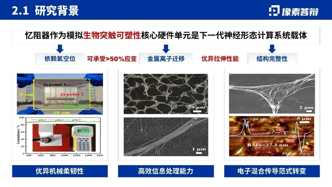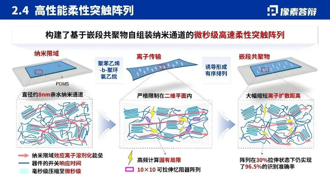 基于嵌段共聚物自组装纳米通道,团队构建了微秒级高速柔性突触阵列,将器件开关响应时间从毫秒级压缩至微秒级。10×10可拉伸忆阻器阵列在30%拉伸状态下,仍实现96.5%的识别准确率,大幅提升高频计算性能。