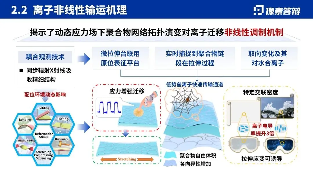 研究团队首次直接观测到动态应力场下聚合物网络拓扑演变对离子迁移的非线性调制机制。通过微拉伸台联用原位表征平台,结合同步辐射X射线吸收精细结构技术,实时捕捉拉伸过程中聚合物链段取向变化及其对水合离子配位环境的动态影响,成功将离子电导率提升3倍。