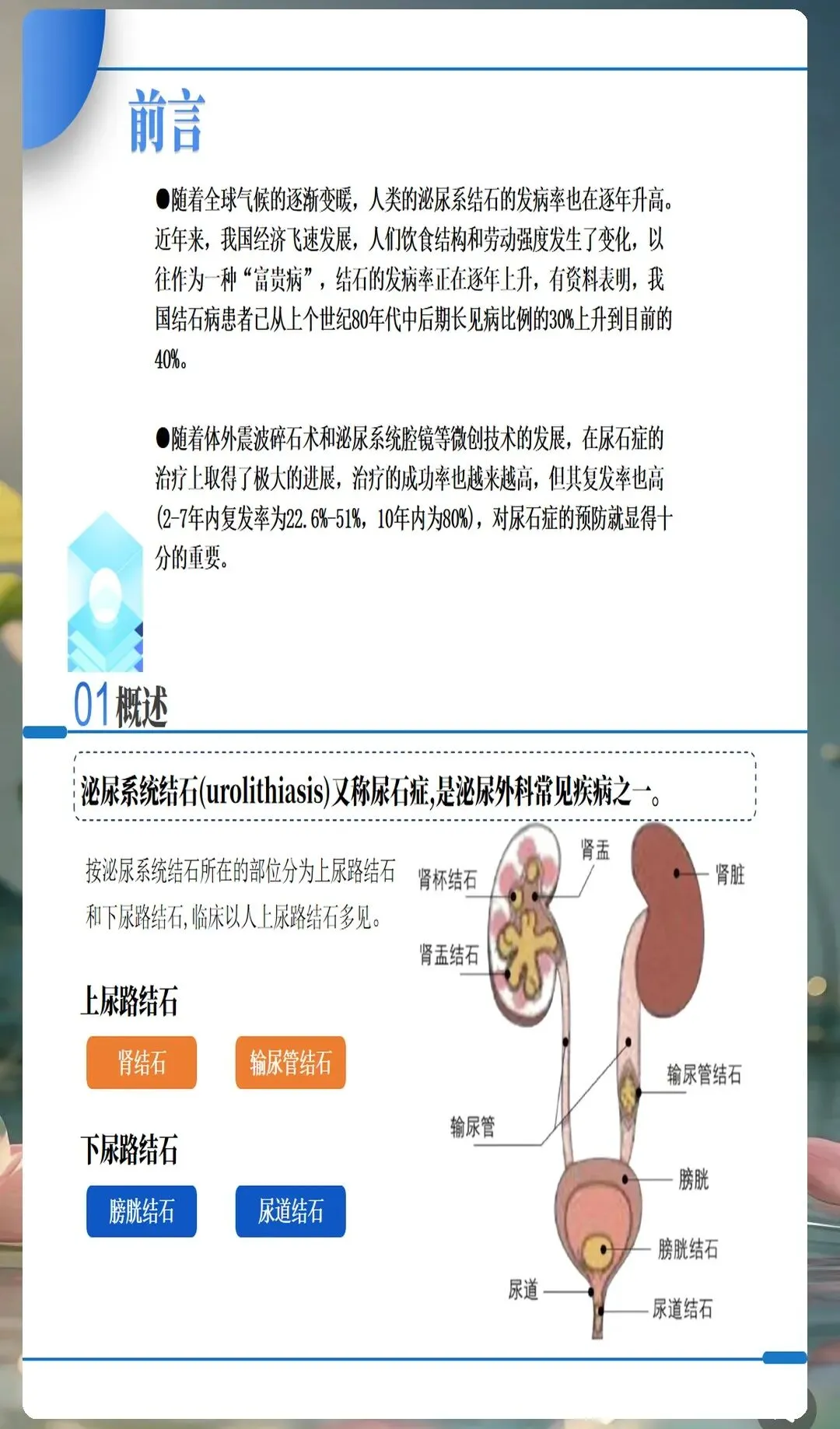 泌尿系结石的复发率较高,健康教育是预防复发的关键措施。健康教育应涵盖饮食调整、生活习惯、定期复查等多个方面,帮助患者建立健康的生活方式,降低复发风险。
